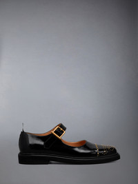 Our classic Mary Janes, reimagined with brass studs replacing traditional broguing, are designed for those who celebrate spunk and individuality. The timeless silhouette is preserved, making them a wardrobe staple for those who appreciate tradition and bold self-expression. Buckle strap closure Signature striped grosgrain loop tabs at heels Upper: 100% Calf Leather Sole: 100% Rubber Lining: 100% Calf Leather Made in Italy FFG002C-E1372-001