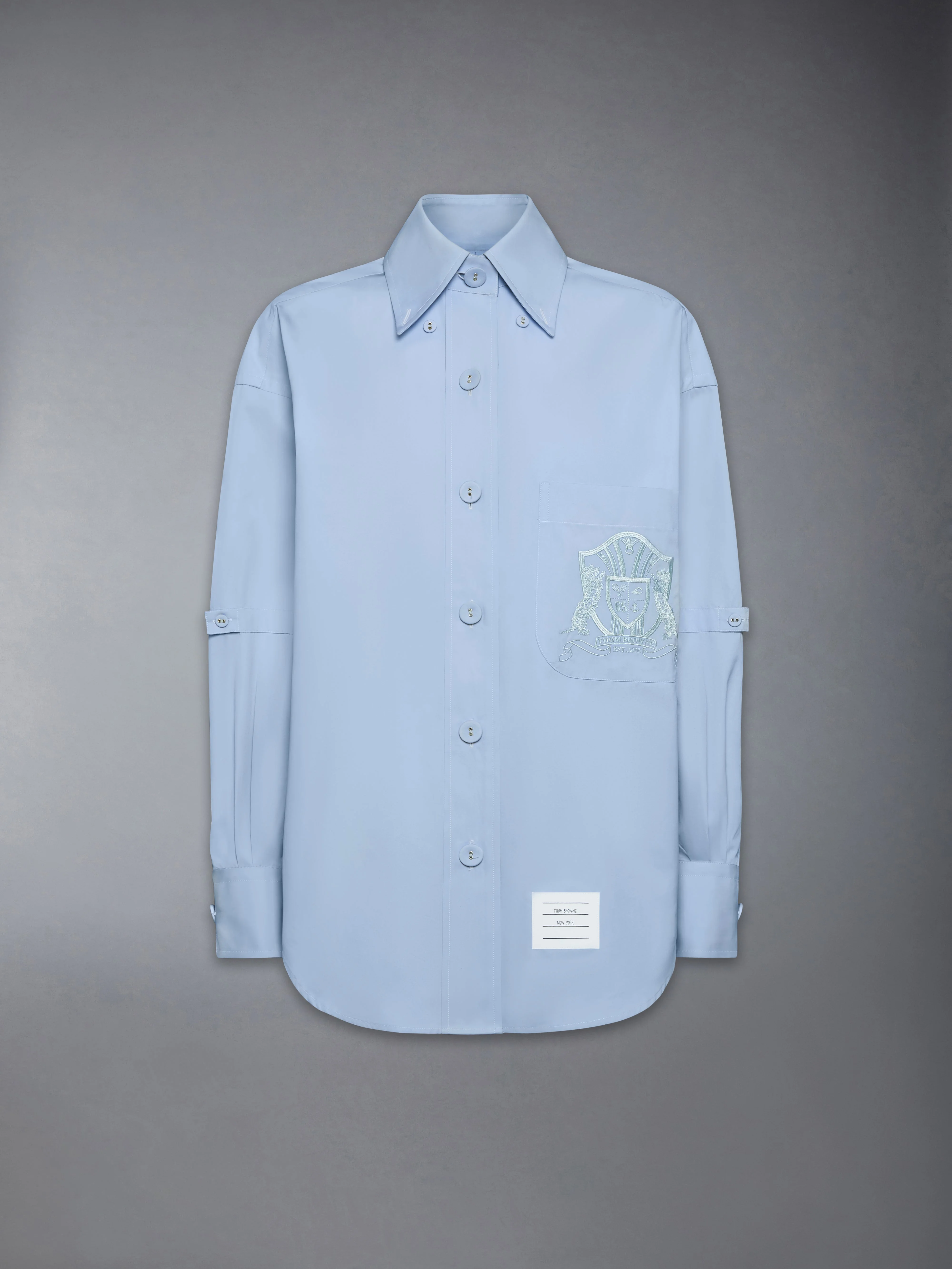 Cut in solid cotton poplin with a supersized silhouette and exaggerated point collar, this shirt features a tonal embroidered crest at the chest pocket—stitched in machine, running, and pencil techniques. Motifs including Hector, crossed tennis rackets, a swimmer, an anchor, and the number 65 come together in a quiet emblem of identity. The composition reflects Thom Browne’s dedication to craft, and his ongoing narrative of sport, discipline, and design. Button-down point collar Front button closure with self-covered buttons Patch chest pocket with embroidered crest Button-fastening self armbands Buttoned cuffs Split pleated back yoke with locker loop Curved hem Signature striped grosgrain loop tab Supersized fit Model is 5'10" (178 cm), wearing size 40 100% Cotton Made in Italy FLL079E-F1004-480