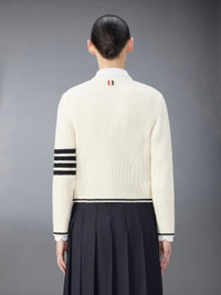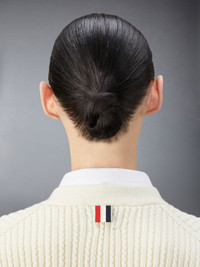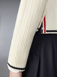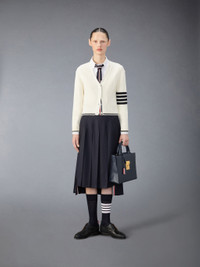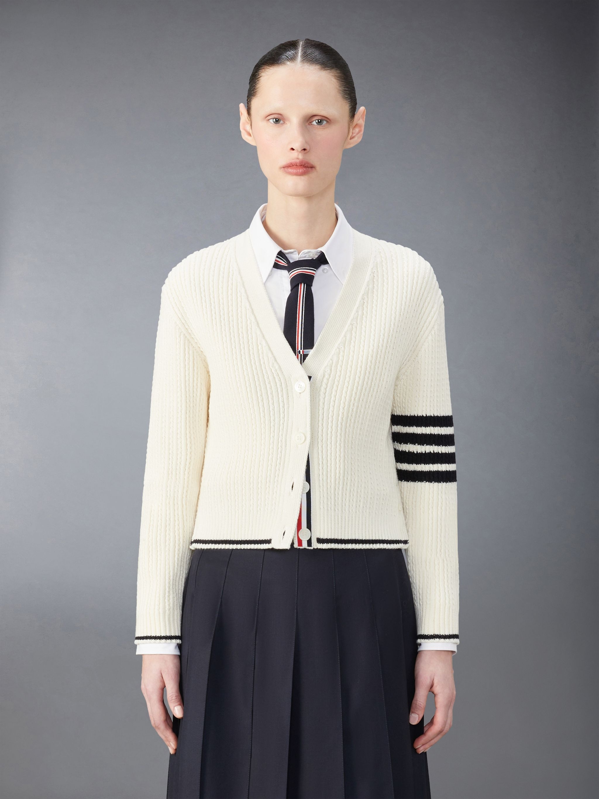 DETAILS & FIT This luxurious cardigan exudes Thom Browne's mastery of innovative design and tailored excellence. It features 4-Bar detailing at the sleeve and signature grosgrain trim at the placket, two emblems synonymous with the brand. V-neckline 4-bar detailing Front button closure with signature striped grosgrain placket Button side vents with signature striped grosgrain trim Signature striped grosgrain loop tab Model is 5'10" (178 cm), wearing size 40 100% Virgin Wool Made in Italy FKC588A-Y1024-100