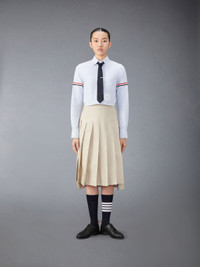 DETAILS & FIT Our Oxford Cropped Armband Striped Shirt exhibits quality craftsmanship and meticulous tailoring. Featuring definitive Thom Browne emblems throughout, and a playful cropped fit. Point collar Front button closure Grosgrain armbands Nametag applique Single chest pocket Pleated back yoke with locker loop Signature striped grosgrain loop tab Model is 5'10" (178 cm), wearing size 40 100% Cotton FLL183O-F0660-415