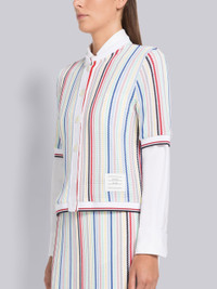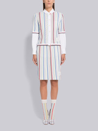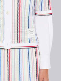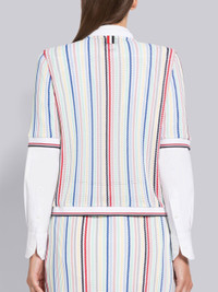 DETAILS & FIT Short sleeve crew neck cardigan in striped American viscose mesh with tipping stripe details at cuffs and hem. Front button closure with striped grosgrain placket. Name tag applique above hem. Signature striped grosgrain loop tab at back of neck. Made in Italy 65% Viscose, 35% Polyamide FJT263AJ0069996