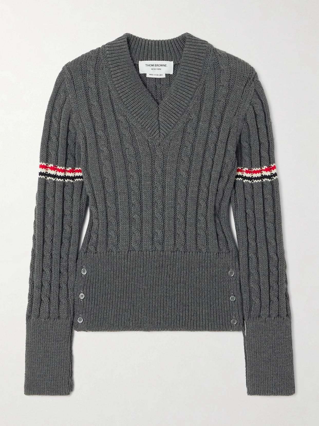 Thom Browne's sweater is recognizable thanks to the tricolor stripes circling the arms. It's cable-knitted from wool and detailed with signature buttoned hems.