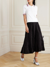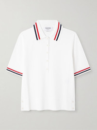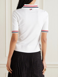 Thom Browne's polo shirt is traced with the designer's signature stripes along the collar and ribbed cuffs. It's made from jersey and has a slim fit. Tuck it into one of the brand's preppy skirts. Size & Fit - Fits true to size, take your normal size - Designed for a slim fit - Lightweight knit - Model is 177cm/ 5'10" and is wearing an IT 40 Model measurements: - Bust: 85cm/ 33.5" - Waist: 65cm/ 25.5" - Hip: 91cm/ 36" Details & Care - White, red and blue jersey - Button fastenings along front - 79% viscose, 16% polyester, 4% polyamide, 1% elastane - Hand wash