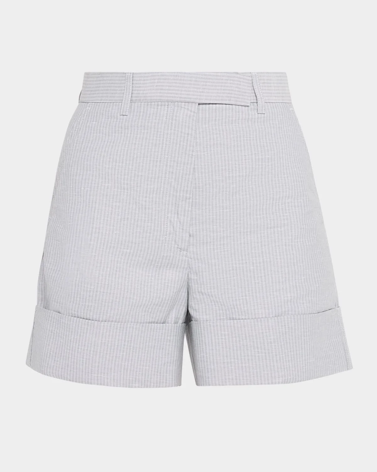 - Thom Browne sack shorts in tonal striped linen-blend with a signature striped tab on the back - Mid rise sits high on hip - Angled side slip pockets - Back button-welt pockets - Easy legs - Rolled cuffs - Hook-tab/ zip fly; belt loops - Linen/cotton - Made in Italy