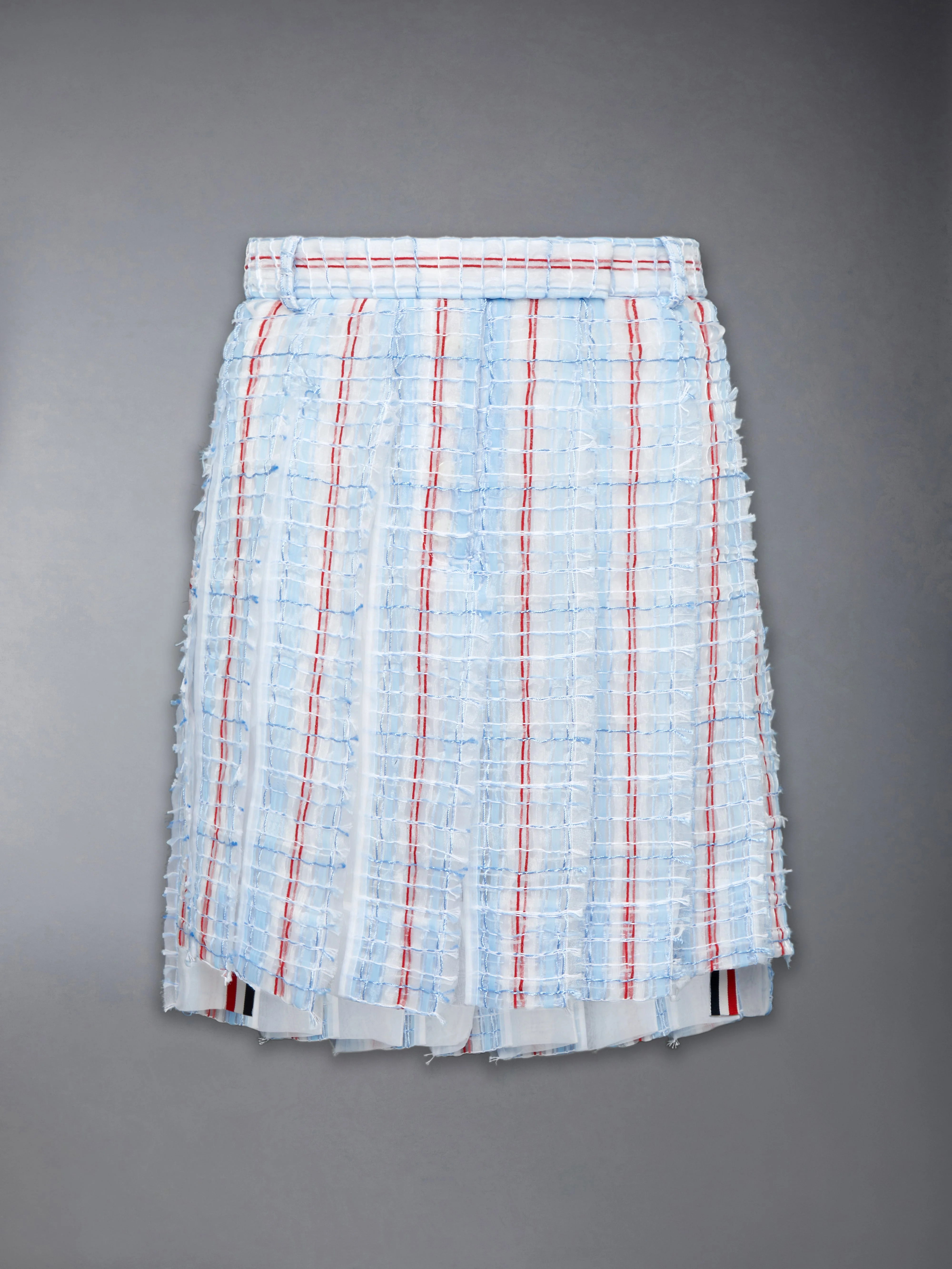 At the intersection of classic codes and the season’s shifted proportions, this classic stripe sheer tweed skirt reflects Thom Browne’s new look in tailored dressing. The lightly crinkled cloth adds a crisp texture to the pleats, while contrast inserts introduce a subtle play in movement. Style with the trompe l’œil boot to extend the collection’s exploration of graphic illusion. Bermuda length Tab closure with hidden button fly Tricolor belt with tumbled leather details and double ring buckle Slip hand pockets Contrasting pleat underlay Stepped hem with RWB grosgrain trim Tricolor lining Allover self trim Signature striped grosgrain loop tab Model is 5'10" (178 cm), wearing size 40 37% Cotton, 32% Polyester, 21% Viscose, 10% Polyamide Combo 1: 100% Silk Lining: 100% Silk Made in Italy FGR082T-F1201-480
