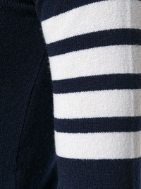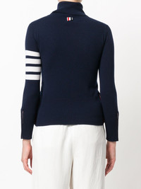 striped turtleneck sweater As renowned for his beloved knitwear as he is for his boundary-pushing tailoring, this knitted top finds Thom Browne editing a familiar favourite with more athletically-inclined detailing. Crafted in the United Kingdom from blue soft cashmere, this sophisticated jumper features a turtle neck, long sleeves, button cuffs, a ribbed hem and cuffs, 4-bar stripes at the sleeve, red, white and blue grosgrain cuff detail and back yoke tab, side buttoned slits and Mother of Pearl buttons. Made in United Kingdom Composition Cashmere 100% SIZE & FIT Model measurements Height 5 ft 10 in(1.79 m) Bust/Chest 32.67 in(83 cm) Hips 33.46 in(85 cm) Waist 24.01 in(61 cm) Measurement SLEEVE LENGTH 27.16 in(69 cm) Shoulder Width 12.59 in(32 cm) LENGTH 20.07 in(51 cm) WAIST 25.19 in(64 cm) BUST 28.34 in(72 cm)