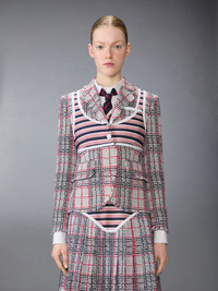 Seaside silhouettes are transformed into illusion through Thom Browne’s signature use of trompe l’œil—depicting a bikini top through striped silk twill overlays and grosgrain trim. Cut in summer tweed, this sport coat reimagines familiar forms with subversive charm and precision. Coordinate with the Trompe-l’Œil Bikini Frayed Summer Tweed Skirt. Front closure with anchor-detailed buttons Welt chest pocket Flap hand pockets Three interior pockets Buttoned cuffs with RWB grosgrain trim Single back vent Tricolor lining Trompe l'œil bikini top in striped silk twill with grosgrain trim Signature striped grosgrain loop tab Model is 5'10" (178 cm), wearing size 40 100% Cotton Combo 1: 55% Silk, 45% Cotton Lining: 100% Cupro Made in Italy FBC954T-F1093-960