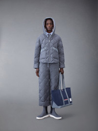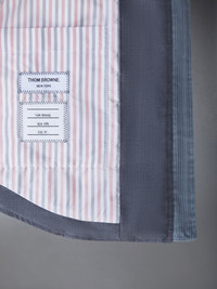 Hooded patch pocket jacket in down-filled grey super 120's twill. Front zip closure, drawstring hood with striped lining. Light blue corduroy trim at hood and pockets. Buttoned cuffs. Slightly rounded hem. Seamed back yoke with locker loop. Striped lining. Signature striped grosgrain loop tab at back of neck. Model is 5'10" (178 cm), wearing size 40 100% Wool Combo 1: 100% Cotton Padding: 80% White Goose Down, 20% White Goose Feathers Lining: 100% Polyester Made in Italy FBD412X-00626-035