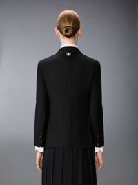 This classic sport coat is tailored in lightweight Super 120's Twill wool twill with a fine hand and clean drape. Allover tonal grosgrain tipping sharpens the silhouette, bringing subtle contrast to its formal structure while reflecting Thom Browne’s precise take on traditional tailoring. Coordinate with the Super 120's Twill Twill Pleated Skirt. Front closure with self-covered buttons Welt chest pocket Flap hand pockets Three interior pockets Buttoned cuffs with RWB grosgrain trim Double back vent Tricolor lining Allover grosgrain tipping Signature striped grosgrain loop tab Fit 1 - Classic fit Model is 5'10" (178 cm), wearing size 40 100% Wool Lining: 100% Cupro Made in Italy FBC637B-00626-001