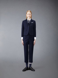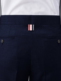 DETAILS & FIT Our Twill Low Rise Slim Trouser. The classic shortened hem pays homage to Thom Browne’s distinguished tailoring. Tab front closure Adjustable buttoned side tabs Creased legs Narrow cuffs Slip side pockets Button-fastening jetted hip pockets Signature striped grosgrain loop tab at back waist Fit 3 Model is 5' 10" (178cm), wearing size 40 100% Wool Lining: 100% Cupro Made in Italy FTC392A-00626-415