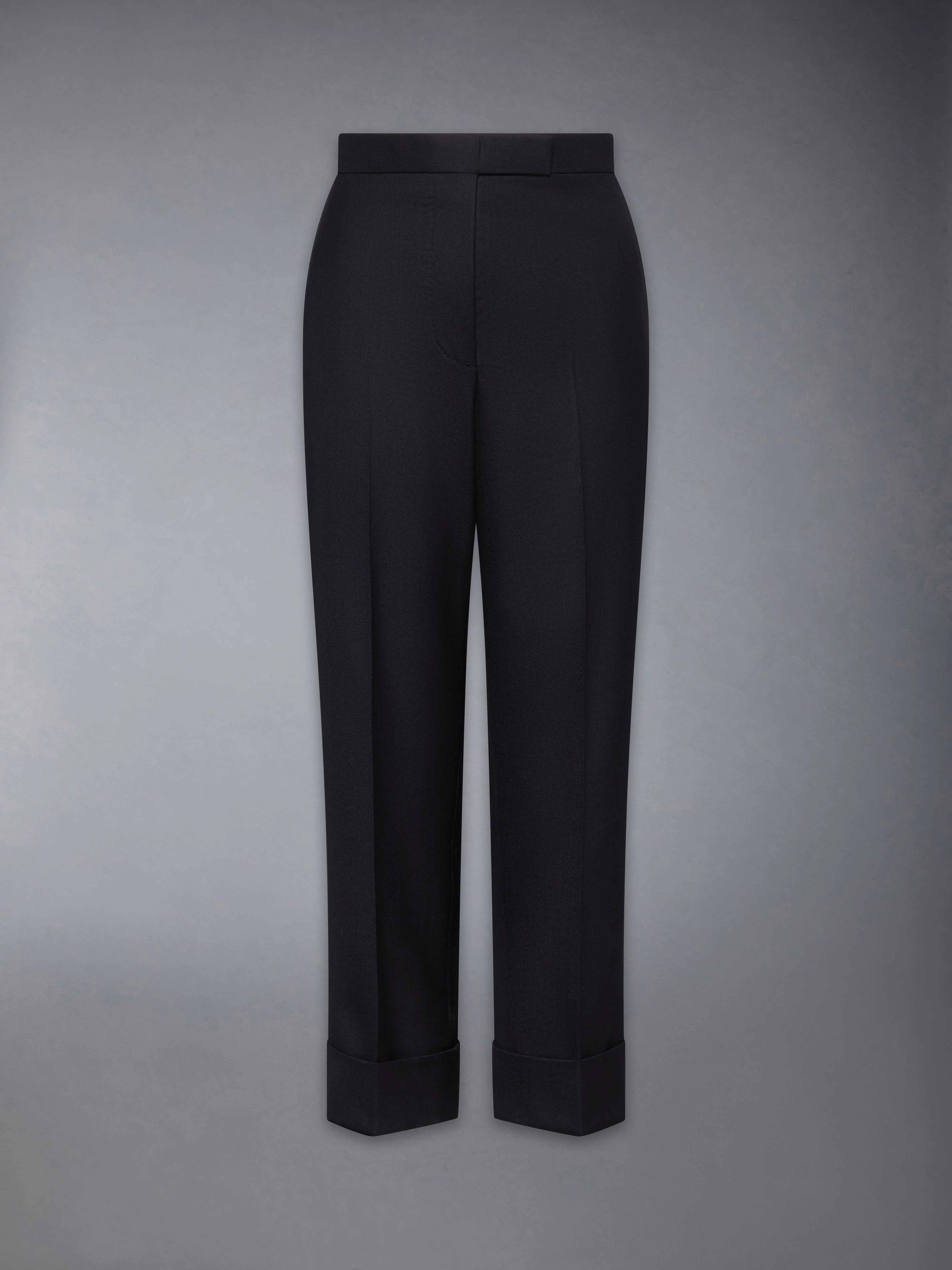 Super 120's Twill wool twill lends soft structure, fluid drape, and subtle polish to these backstrap trousers—lightweight and smooth with a naturally refined finish. Tailored with tonal tuxedo stripes in reference to the season’s black tie focus, the silhouette is clean and exacting, balancing formal codes with the discipline of uniform dressing. Tab closure with zip fly Slip hand pockets Buttoned back welt pockets Tuxedo side stripes Cuffed hem with internal RWB grosgrain trim Adjustable buttoned backstrap Tricolor lining Signature striped grosgrain loop tab Model is 5'10" (178 cm), wearing size 40 100% Wool Lining: 100% Cupro Made in Italy FTC507B-00626-001