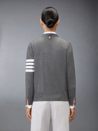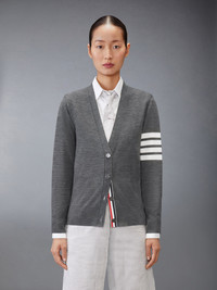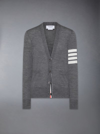 DETAILS & FIT Two Thom Browne emblems define our Wool 4-Bar V-neck Cardigan —grosgrain trim and 4-Bar stripe detailing, both synonymous with the brand. Presented in fine virgin wool fabric, this roomy cardigan exudes sophistication. V-neck Front button closure with striped grosgrain placket 4-bar stripe detail at left sleeve Buttoned side vents and cuffs with signature striped grosgrain trim Signature striped grosgrain loop tab at back of neck Model is 5' 10" (178cm), wearing size 40 100% Virgin Wool Made in Italy FKC334A-Y1014-035