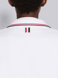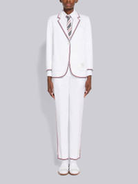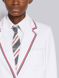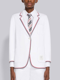 DETAILS & FIT Sack jacket in white tech twill with allover striped grosgrain framing. 2-button front closure, notched lapels, 3 patch front pockets. Name tag applique at left front pocket. Buttoned cuffs with signature striped grosgrain trim. Single back vent. Signature striped grosgrain loop tab at back of neck. Sack - Fit 2. Model is 5'10" (178 cm), wearing size 40 Made in Italy 100% Cotton FJT248AJ0042100