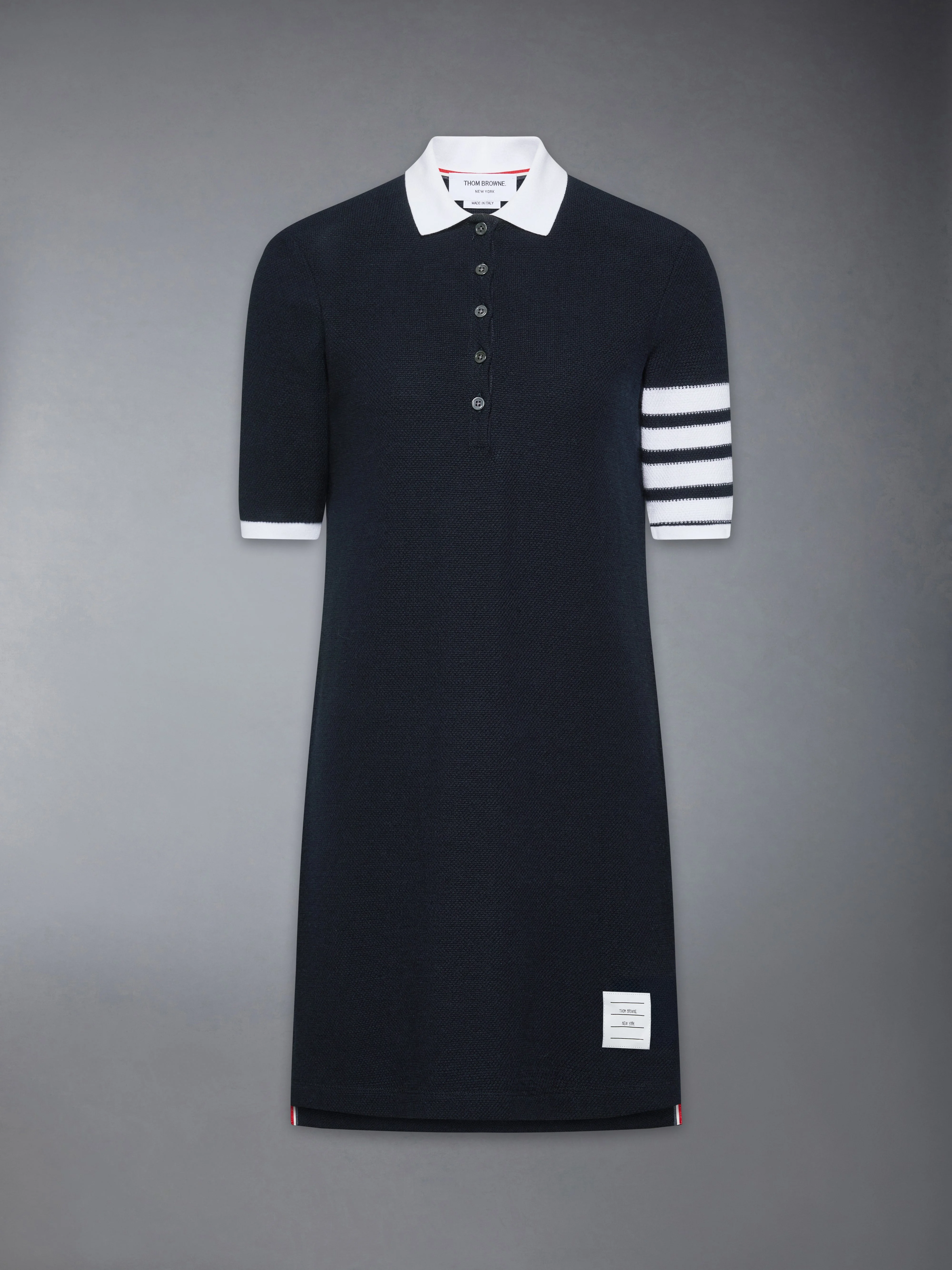 This short-sleeve dress is knit in textured cotton pique and marked by engineered 4-bar striping. A ribbed polo collar and grosgrain-trimmed vents underscore the athletic reference, refined through Thom Browne’s tailored lens. Pair with the Hector Baguette bag to add playful contrast. Partial front button closure Ribbed polo collar and cuffs Side vents with RWB grosgrain trim Stepped hem 4-bar detailing Name tag applique Signature striped grosgrain loop tab Model is 5'10" (178 cm), wearing size 59 100% Cotton Combo 1: 90% Cotton, 10% Elastane Made in Italy FJD134A-J0248-415
