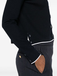 4 Bar Stripes textured cardigan Highlights - Navy blue - Front button fastening - Buttoned cuffs - Two side button-fastening pockets - Signature grosgrain side tabs Made in Italy Composition Virgin Wool 100% Washing instructions Dry Clean Only
