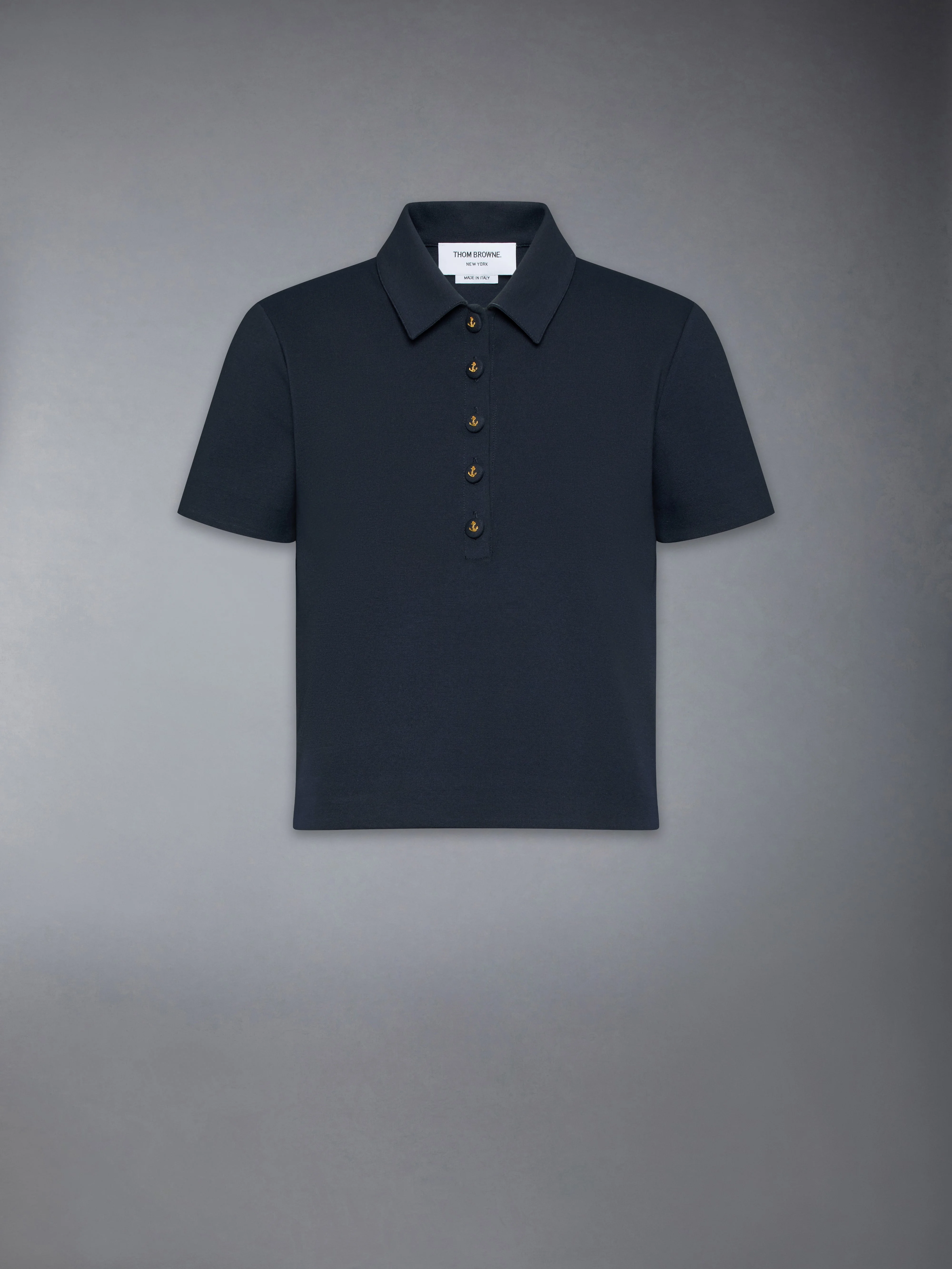 Timeless sophistication. This classic polo is elevated with gold buttons embossed with the Thom Browne insignia—a subtle yet striking detail. Layer it under our Pinstripe High Twist Wool Sport Coat and Skirt. Partial front button closure Signature striped grosgrain loop tab Model is 5'10" (178 cm), wearing size 40 100% Cotton Made in Italy FJP111A-J0215-415