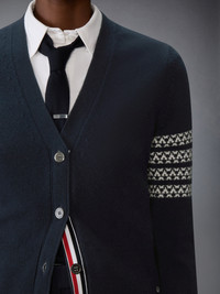A seasonal scene rendered in soft merino wool. This classic V-neck cardigan features a festive jacquard motif complete with snowflakes, sleds, reindeer—and Hector, Thom Browne’s beloved dachshund. A playful interpretation of winter tradition, it brings warmth and character to the uniform. V-neck Front button closure with RWB grosgrain placket Ribbed buttoned cuffs with RWB grosgrain trim Buttoned side vents with RWB grosgrain trim Ribbed hem Signature striped grosgrain loop tab Classic fit Model is 5'10" (178 cm), wearing size 40 100% Virgin Wool Made in Italy FKC687A-Y1029-415