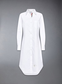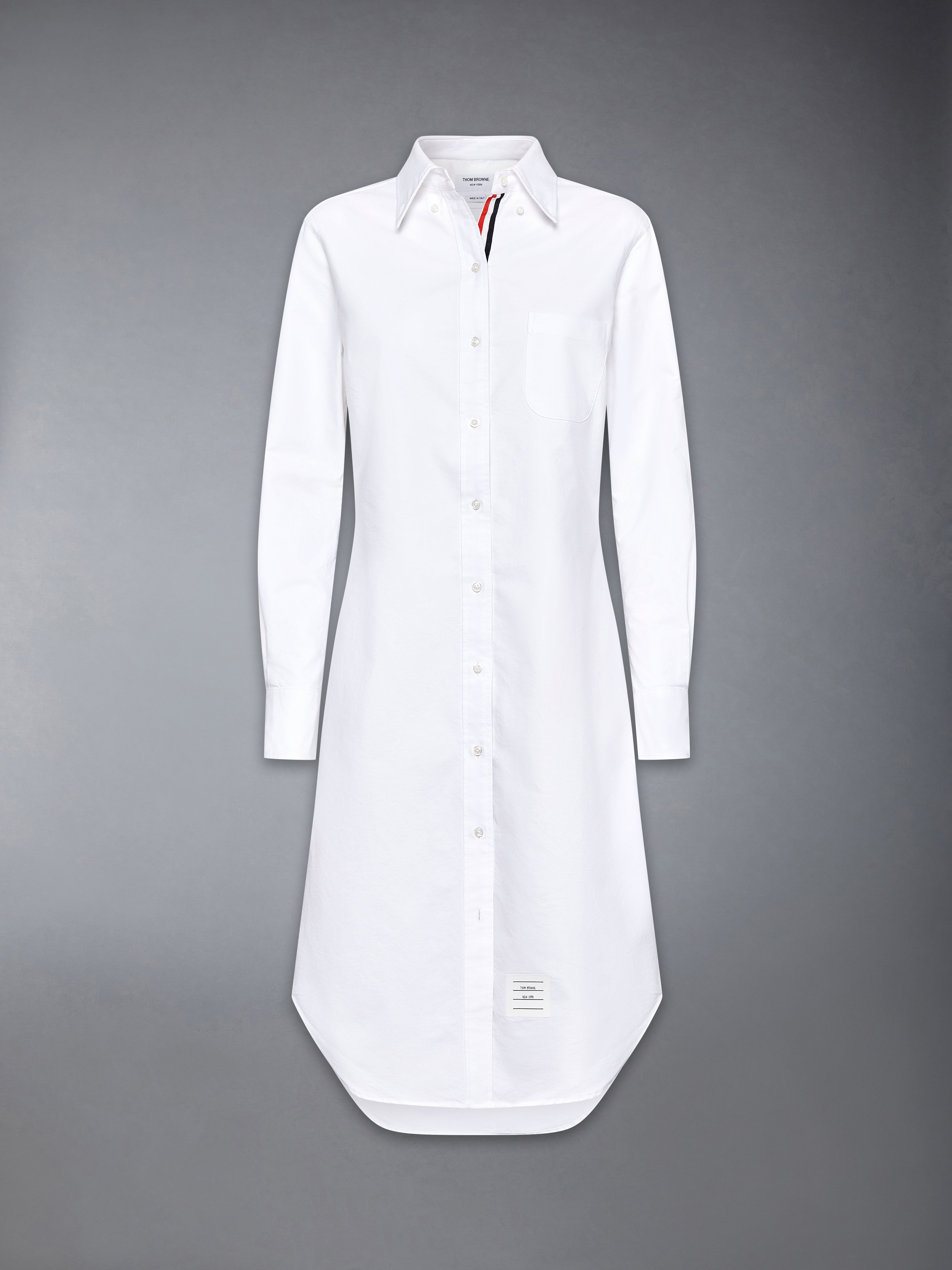 Our Oxford Grosgrain Placket Knee length Point Collar Shirtdress. Crafted from the finest fabric, wear this silhouette alone as an everyday staple or as a base layer for suiting. Front button closure with striped grosgrain placket Point collar Barrel cuffs Single chest pocket Name tag appliquA© above hem Seamed back yoke with locker loop Model is 5' 10" (178cm), wearing size 40 100% Cotton Made in Italy FDS001E-06177-100