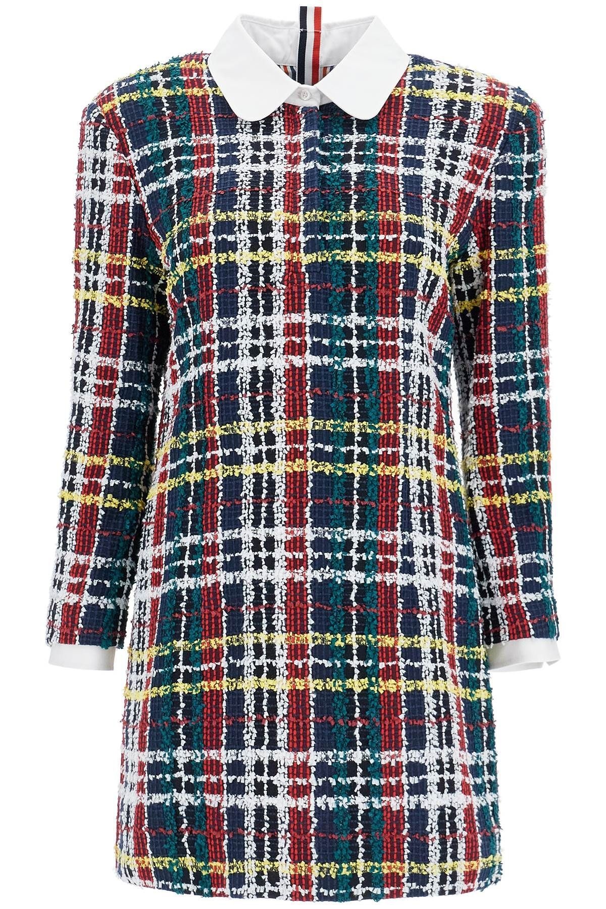 The Thom Brown mini dress is made of check tweed and stands out for its shirt-style details such as the rounded collar, contrasting cuffs that peek out from the sleeves, and half-button closure. It features structured shoulders, an iconic grosgrain tab on the back of the neck, and is fully lined with striped silk. The model is 177 cm tall and wears a size IT 40. PRODUCT DETAILS Made In: Italy Composizione: 75% CO 25% PA Supplier Color Code: SEASONAL MULTI Supplier Code: FDSE84C F0671 FTA: No Season: FW24 Fit: Nessuno, Regular Fit, Short Fastening Type: Nessuno, Zip