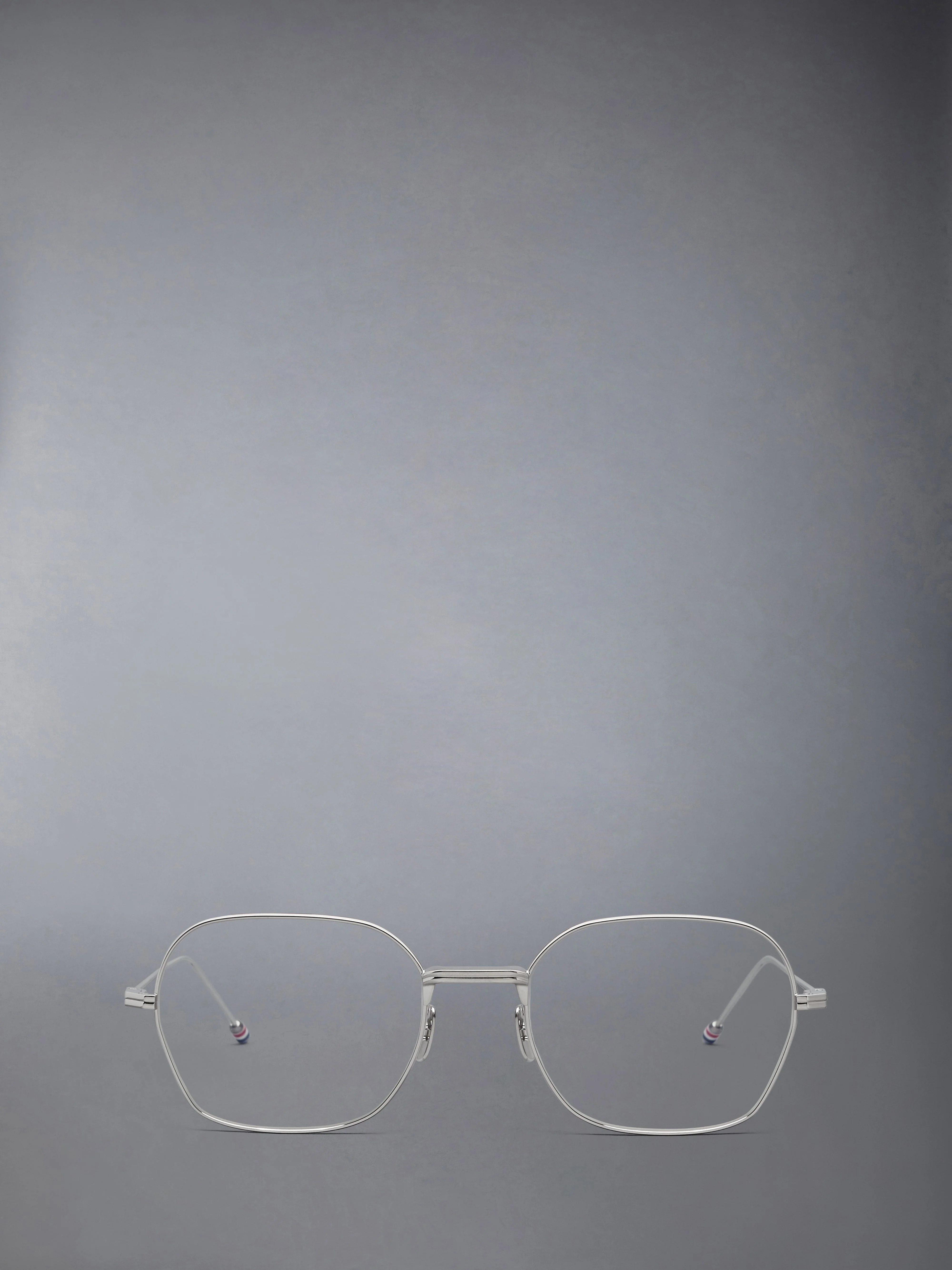 Minimal in form, meticulous in design. These frames, made in Japan from premium materials, highlight scale and craft by balancing structure with subtlety. Anti-reflective lenses reduce glare and enhance optical clarity, while 4-bar detailing and tricolor enamel temple tips finish the design, bringing Thom Browne’s refined vision to daily wear. Rectangular shape Signature 4-bar Striped enamel temple tips Eco-leather case Frame: silver Hinges: silver Lenses: clear-ar Lens Width: 54mm Nose Bridge Length: 20mm Temple Length: 144mm 100% Titanium Made in Japan UEO945A-G0001-045