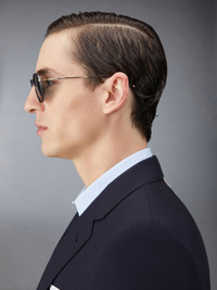 DETAILS & FIT Round sunglasses in matte black and brushed gold tone titanium with black tinted lenses. Textured black nose bridge and frame, gold tone nose pads, matte black temple tips with striped enamel detail. Leather case with signature striped grosgrain loop tab at entry. Lens Width: 52mm Nose Bridge Length: 21mm Temple Length: 140mm 100% Titanium Made in Japan UES119A-G0001-001-52