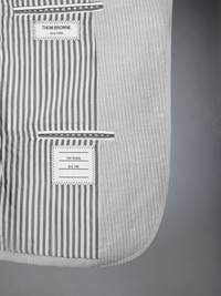 Inspired by 19th-century work uniforms, this seasonal pinstripe sport coat features subtle Thom Browne emblems throughout. Complete the suit with our Stripe Linen Cotton Beltloop Sack Shorts. Front button closure 3 Front patch pockets Buttoned cuffs with signature striped grosgrain trim Interior pockets with name tag Signature striped grosgrain loop tab Fit 2 Model is 5'10" (178 cm), wearing size 40 60% Linen, 40% Cotton Lining: 100% Cupro Made in Italy FBC782H-F0940-055 FBC782H-F0940-055