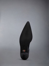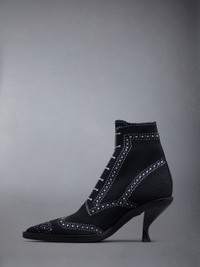 DETAILS & FIT Pointed toe boot in knit jacquard with allover trompe l'oeil lace up brogue detailing and 75mm curved heel. Leather sole and heel with tonal rubber cap, striped lining. Signature striped grosgrain loop tabs at heels. Combo 2: 100% Polyester Upper: 100% Elastane Sole: 100% Calf Leather Lining: 100% Calf Leather Made in Italy FFH264AE0662980