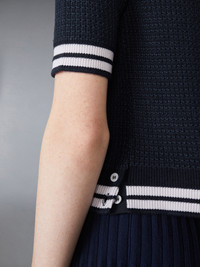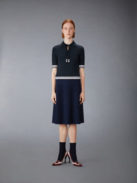 Perfect for transitional dressing, this striking top offers lightweight warmth and breathable comfort. Crafted from a luxurious blend of silk, cashmere, and Merino wool, it features an elegant keyhole collar and contrast cricket stripes at the cuffs and hem—a subtle nod to mid-century sports uniforms. Pair with our Plisse Merino Wool Silk Skirt. Keyhole at collar Buttoned side vents Signature striped grosgrain loop tab Model is 5'10" (178 cm), wearing size 40 45% Silk, 26% Wool, 25% Cashmere, 4% Polyester Combo 1: 61% Silk, 18% Cashmere, 16% Wool, 5% Polyester Combo 2: 67% Silk, 15% Cashmere, 14% Wool, 4% Polyester Made in Italy FKP128B-Y4007-415