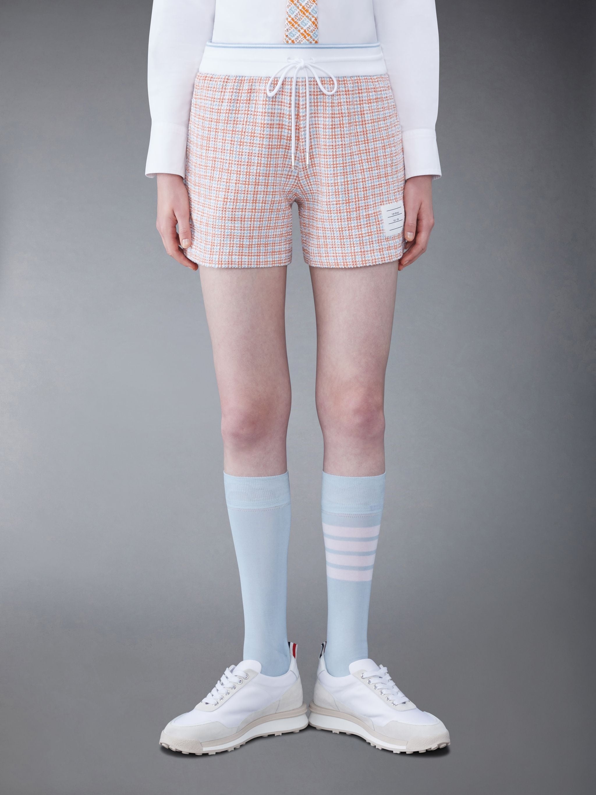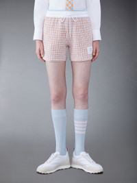 DETAILS & FIT Leisurewear made artful. These comfortable shorts are adorned with signature Thom Browne emblems throughout. Our fine tweed fabric is sourced from a fabric mill founded in 1912 in Carlisle, England. Drawstring waistband with silver tone aglets Slip side pockets Name tag applique above left hem Signature striped grosgrain loop tab Model is 5'10" (178 cm), wearing size 40 91% Cotton, 8% Polyamide, 1% Elastane FJQ107A-J0113-825