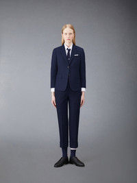 DETAILS & FIT Our Classic Twill Backstrap Trouser. The classic shortened hem pays homage to Thom Browne’s distinguished tailoring. Tab front closure Creased legs Wide cuffs Slip side pockets Button-fastening jetted hip pockets Notched back waist Signature striped grosgrain loop tab at back waist ClassicFit 1 Model is 5' 10" (178cm), wearing size 40 100% Wool Lining: 100% Cupro Made in Italy FTC337A-00626-415