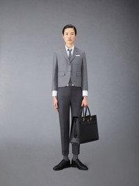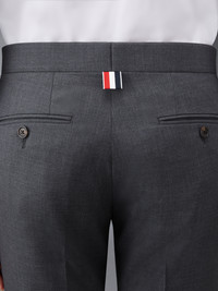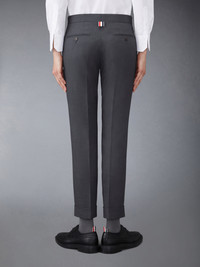Our Twill Low Rise Skinny Trouser. The classic shortened hem pays homage to Thom Browne distinguished tailoring. Super 120's twill Tab front closure Skinny fit Adjustable Buttoned side tabs Creased legs Narrow cuffs Slip side pockets Button fastening back welt pockets Signature striped grosgrain loop tab at back waist Low Rise - Fit 3 Model is 5' 10" (178cm), wearing size 40 100% Wool Lining: 100% Cupro Made in Italy FTC025V-00626-025
