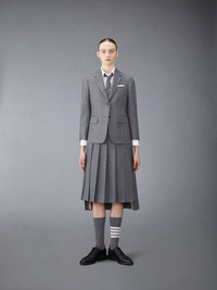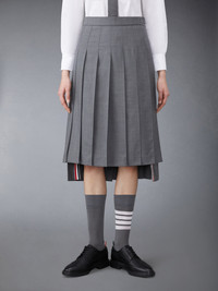 Inspired by East Coast preppy icons but reimagined with inventive proportions and quality craftsmanship, our Classic Dropped Back Below Knee Pleated Skirt is a fresh take on a traditional silhouette. Adjustable Buttoned side tab closure Dropped back with signature striped grosgrain trim Signature striped grosgrain loop tab at back waist Model is 5' 10" (178cm), wearing size 40 100% Wool Lining: 100% Cupro Made in Italy FGC400V-00626-035