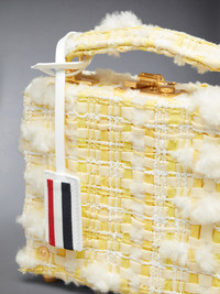 Micro attache case in yellow and white cotton twill pouf tweed with removable woven brass chain and grosgrain ribbon shoulder strap. Locking brass clasp, tweed-covered top handle, striped leather luggage tag. Brass riveted and footed details. Striped lining with interior pocket. Brass hardware. 67% Cotton, 11% Acrylic, 11% Polyester, 8% Virgin Wool, 3% Polyamide Combo1:100% Calf Patent Leather Lining:100% Polyester Lining2:100% Lamb Leather Made in Italy FAP191A-F0292-740