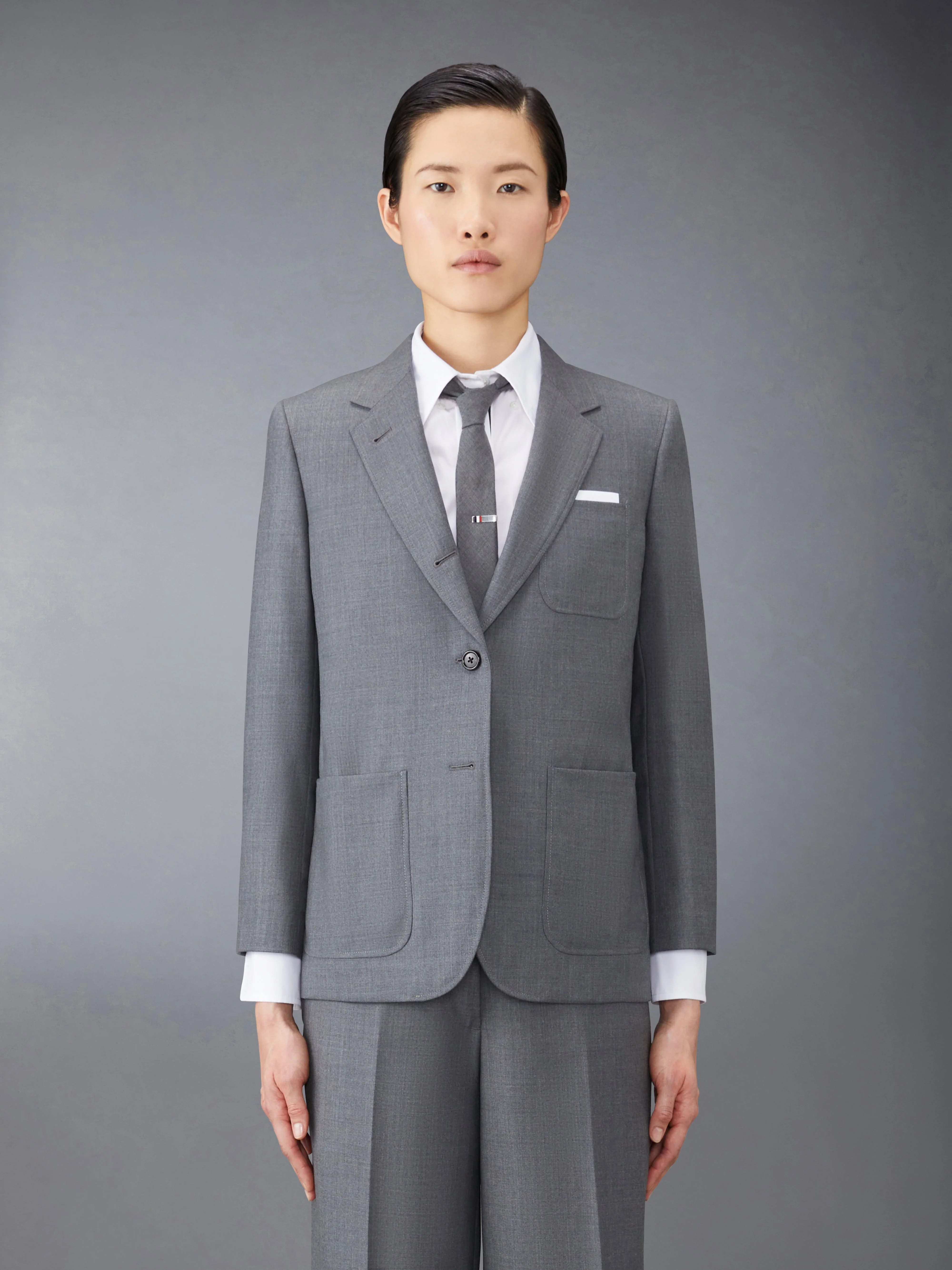 DETAILS & FIT Our Twill Sack Sport Coat embraces a relaxed, wide fit for ultimate comfort while remaining true to Thom Browne’s classic heritage. Front button closure 3 patch pockets Notched lapels Buttoned cuffs with signature striped grosgrain trim Signature striped grosgrain loop tab at back of neck Model is 5' 10" (178cm), wearing size 40 100% Wool Lining: 100% Cupro Made in Italy FBC334A-00626-035