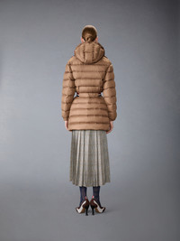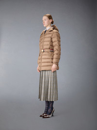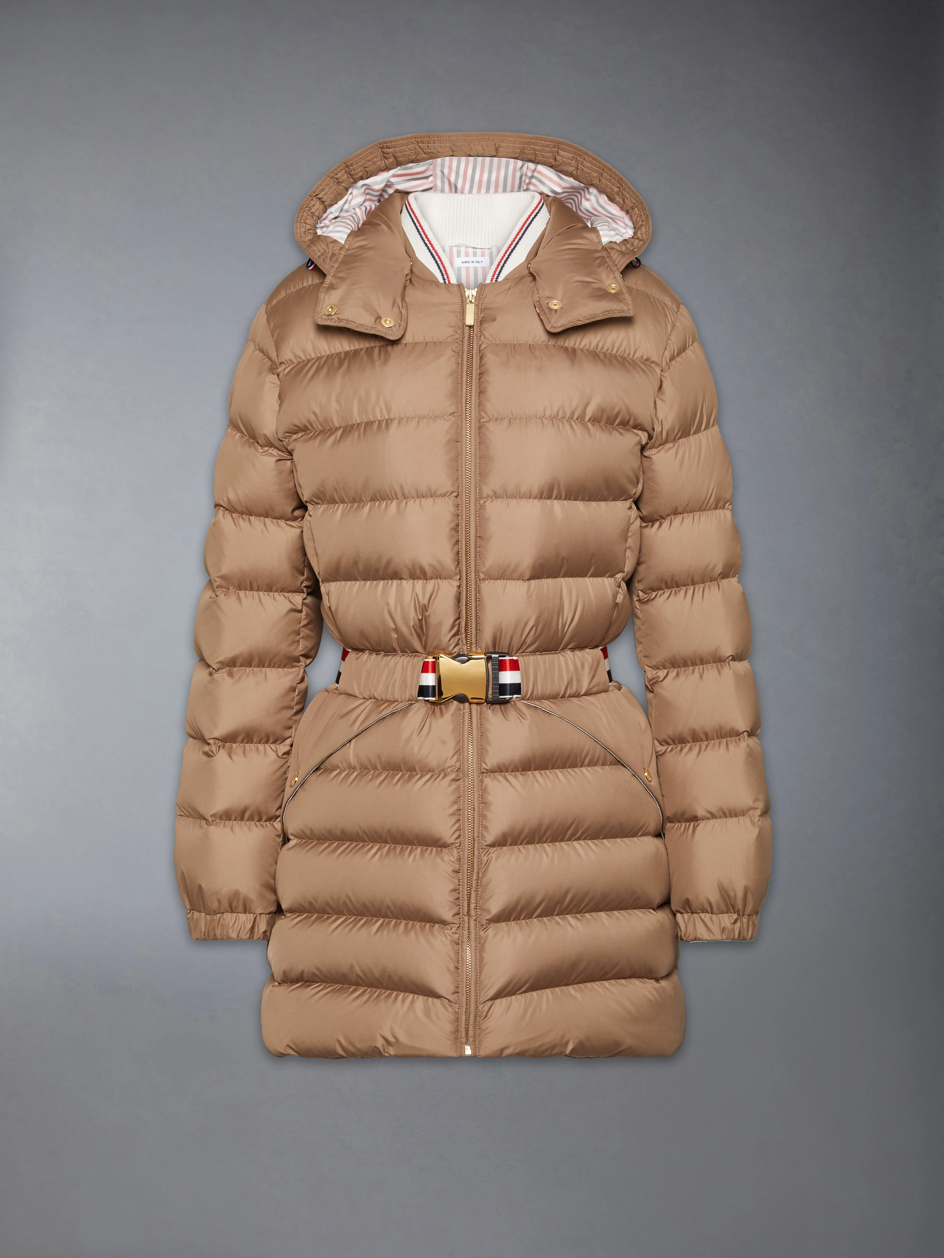Effortless sophistication meets everyday practicality. This luxurious down jacket features a flattering belted waist and is finished with a gold buckle framed by our signature red, white, and blue trim. Two discreet, roomy pockets with snap button closures—engraved with the Thom Browne insignia—reflect Thom’s meticulous eye, never compromising functionality for elegance. Stay warm all season long in ultimate style. Front zip closure Belted waist Side slip snap button pockets Detachable hood Signature striped grosgrain loop tab Model is 5'10" (178 cm), wearing size 40 100% Polyester Combo 1: 80% Grey Duck Down, 20% Grey Duck Feathers Combo 2: 100% Wool Lining: 100% Polyester Made in Italy FOD103X-F0241-210