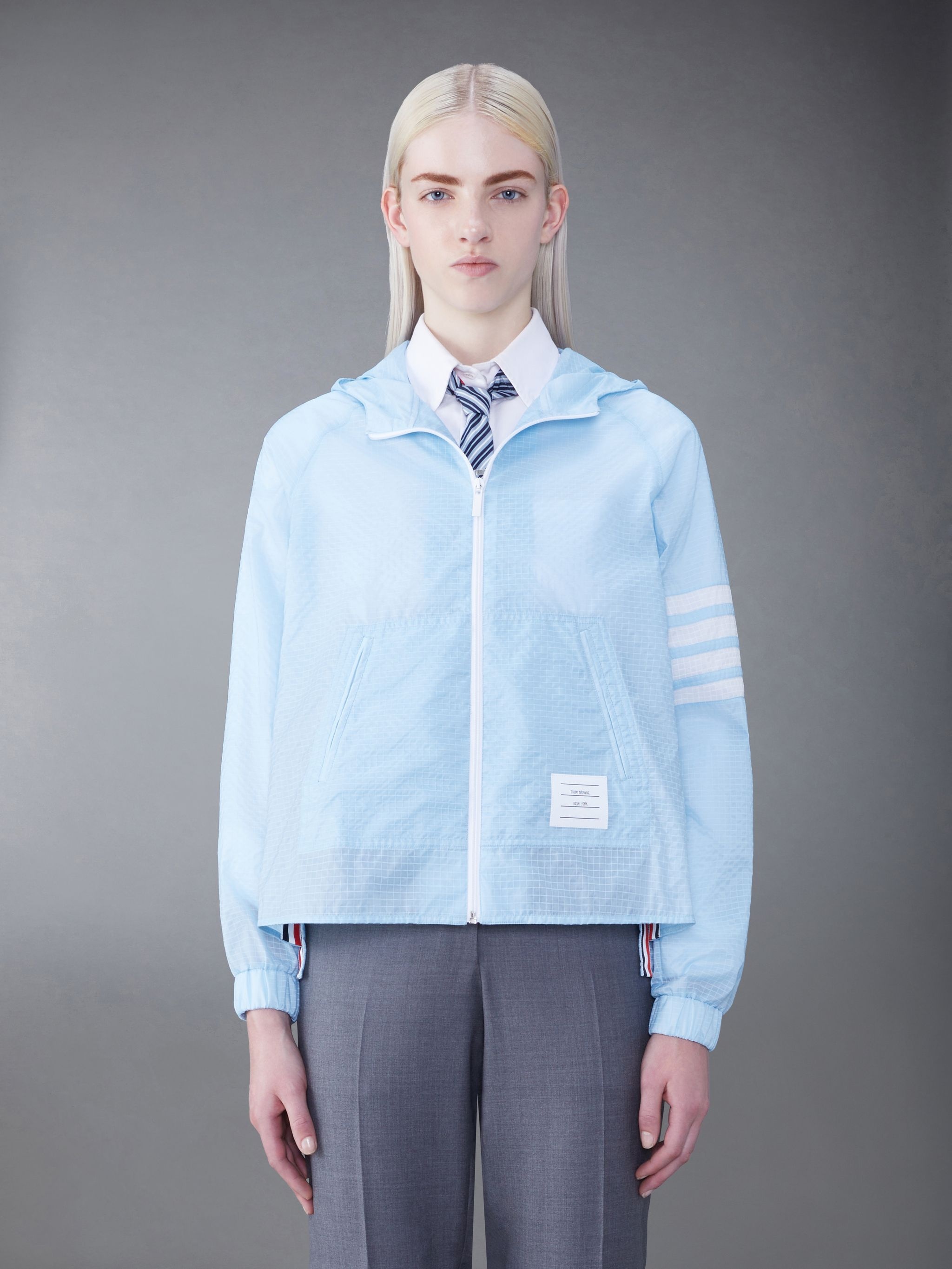DETAILS & FIT A breathable layer perfect for running errands during humid spring days. Our Ripstop fabric is ultra-durable, tear and rip-resistant with a water-repellent finish. Front zip closure 4-bar detailing Slip side pockets Name tag applique Button side vents with signature striped grosgrain trim Model is 5'10" (178 cm), wearing size 40 100% Polyamide FJT316A-F0517-460