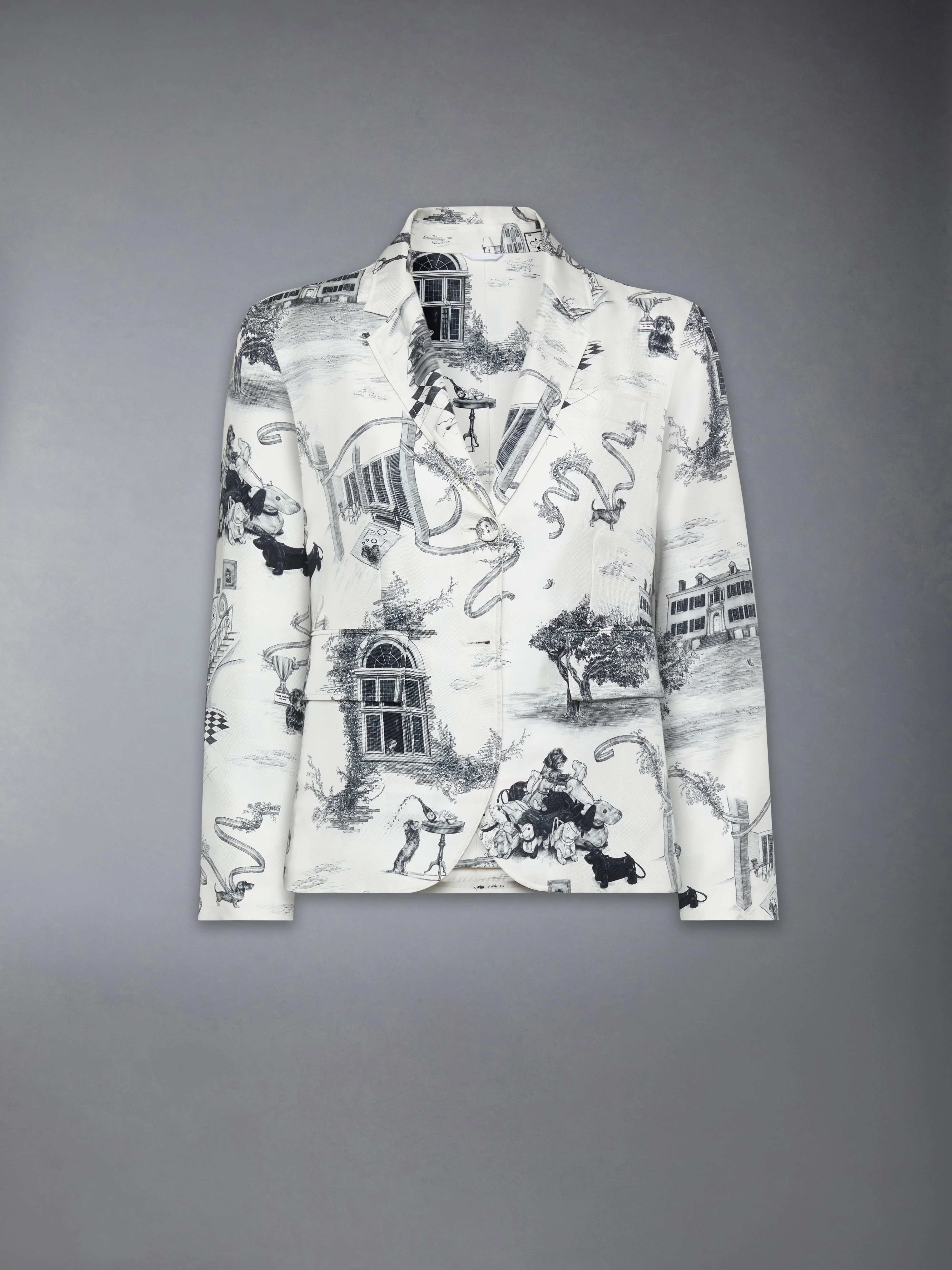 In celebration of Hector’s tenth year as a brand icon, this sport coat features a highly personal tableau that is part portrait, part pastoral dream. The print draws elements from Thom Browne’s own upstate world, depicting the beloved dachshund in a series of whimsical vignettes across the piece’s unconstructed silk twill silhouette, elevated through storytelling and craft. Front closure with self-covered buttons Contrast felt undercollar Chest welt pocket Flap hand pockets Three interior pockets Shaping darts on front Buttoned cuffs with RWB grosgrain trim Double back vent with internal RWB grosgrain and button connector Signature striped grosgrain loop tab Fit 3 - High armhole Model is 5'10" (178 cm), wearing size 40 100% Silk Lining: 100% Silk Made in Italy FBC812A-F1133-980