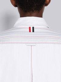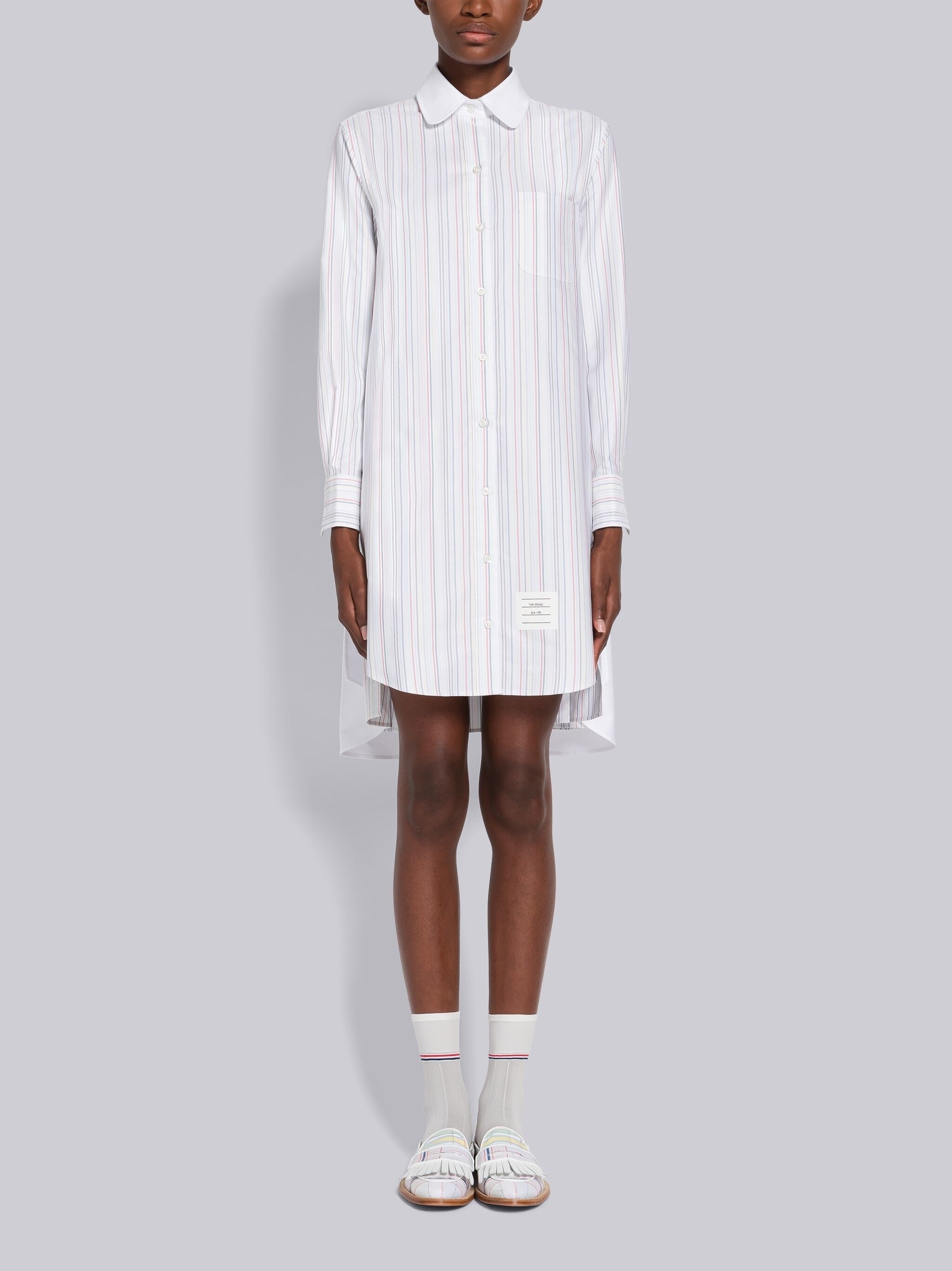 DETAILS & FIT Mini shirtdress in university stripe poplin with single inverted pleat at center back. Front button closure, rounded shirt collar, patch chest pocket, name tag applique above shirttail hem. Pleated back yoke with locker loop. Signature striped grosgrain loop tab at back of neck. Made in Italy 100% Cotton FDSD95CF0272996