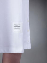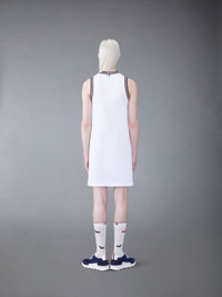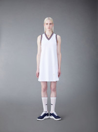 DETAILS & FIT Inspired by East Coast preppy icons, this tennis dress borrows from Thom Browne's very own love of sport. Find our signature nametag applique at the front hem and our distinct grosgrain trim at the back. V neckline Name tag applique above hem Signature striped grosgrain loop tab Model is 5'10" (178 cm), wearing size 40 100% Cotton FJD108A-00050-100
