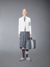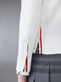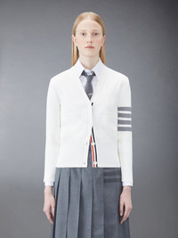DETAILS & FIT Two Thom Browne emblems define our Milano Classic 4-Bar V-neck Cardigan—grosgrain trim and 4-Bar stripe detailing, both synonymous with the brand. Presented in cotton crepe fabric, this cardigan exudes sophistication. V-neckline Front button closure with striped grosgrain placket 4Bar stripe detail at left sleeve Slip Front pockets Buttoned side vents and cuffs with signature striped grosgrain trim signature striped grosgrain loop tab at back of neck Model is 5' 10" (178cm), wearing size 40 100% Cotton Made in Italy FKC207A-00219-100