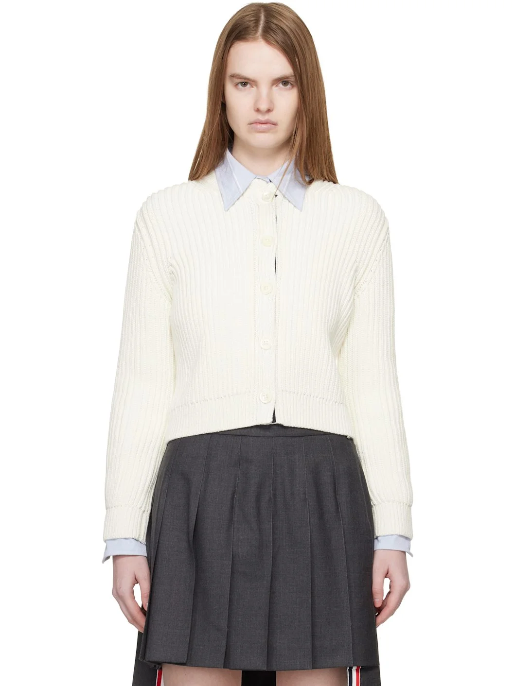 Rib-knit cotton cardigan. · Crewneck · Button closure · Cropped hem · Surgeon's cuffs · Tricolor flag at back collar Supplier color: White 100% cotton. Made in Italy 261381F095018