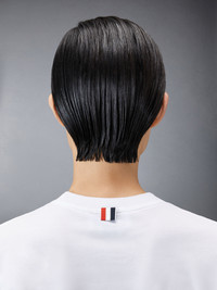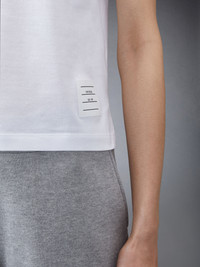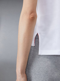 DETAILS & FIT A silhouette that has stood the test of time, our Jersey Relaxed Side Slit Tee is enriched with a breathable side slit and Thom Browne emblems throughout. Bound Crew neckline Name tag applique above hem Signature striped grosgrain loop tab at back of neck Model is 5' 10" (178cm), wearing size 40 100% Cotton Made in Japan FJS036A-05398-100 - SLEEVE LENGTH: 9.0cm - Shoulder Width: 35.0cm - Length: 55.0cm - WAIST: 78.0cm - BUST: 80.0cm