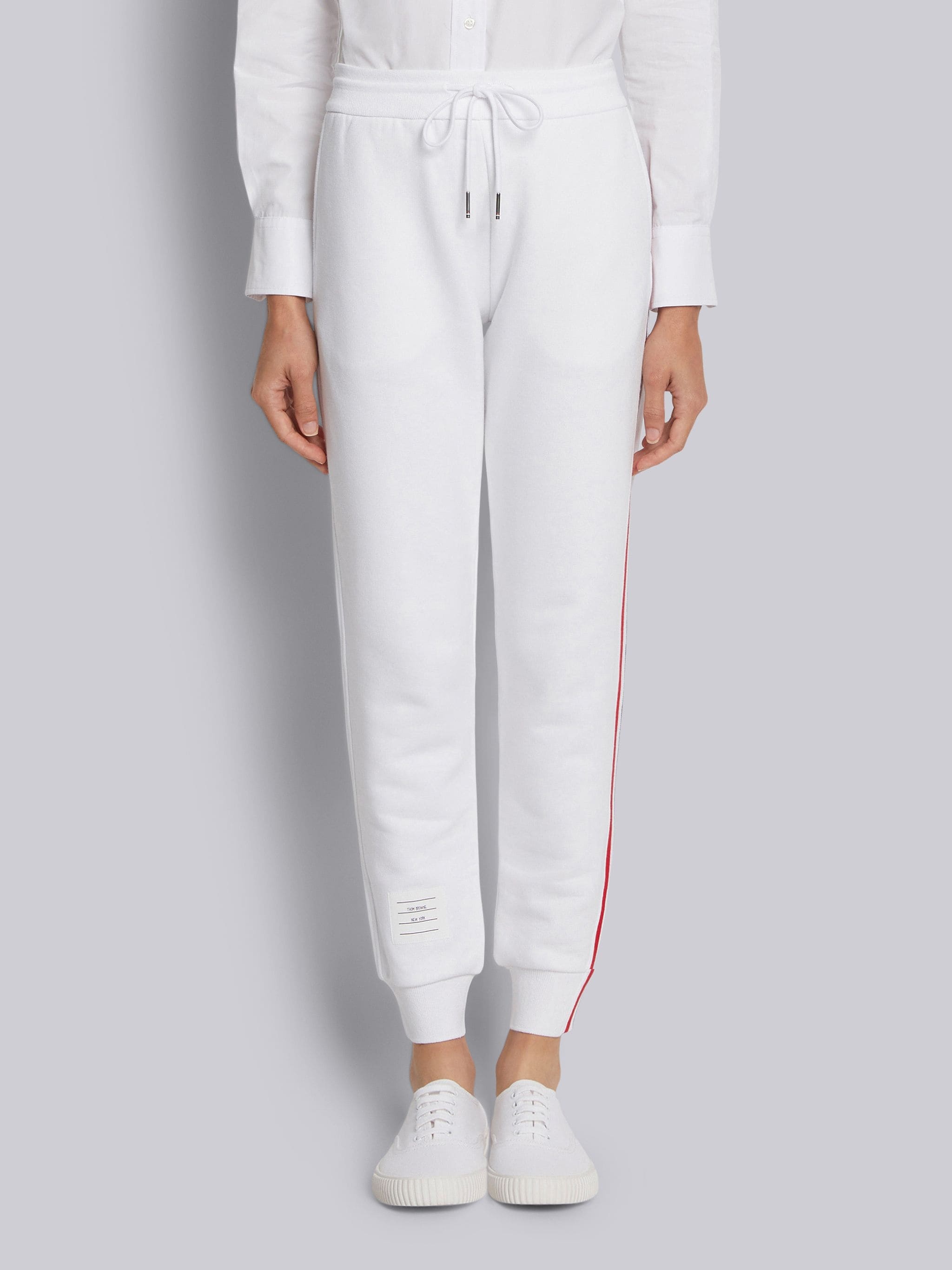 DETAILS & FIT White Sweatpants Classic Loopback Left RWB Stripe Adjustable Drawstring Exterior 4-Bar Tag Signature Grosgrain Loop Tab Model is 5'10" (178 cm), wearing size 40 NOTES 100% Cotton Made in Italy FJQ024A03377100