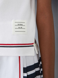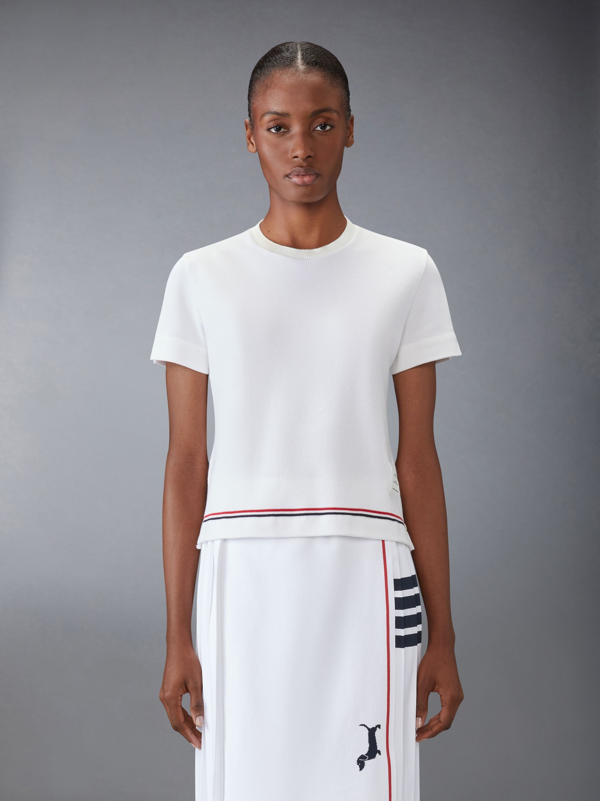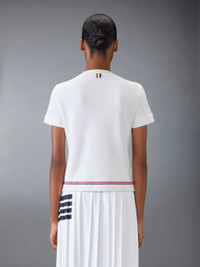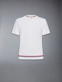 DETAILS & FIT A casual tee dressed up with signature Thom Browne emblems. Elevate it with a Thom Browne pleated skirt, or dress it down with sweatpants for head-to-toe comfort. Name tag applique Signature striped grosgrain loop tab Model is 5'10" (178 cm), wearing size 40 100% Cotton Made in Italy FJS193A-J0185-100