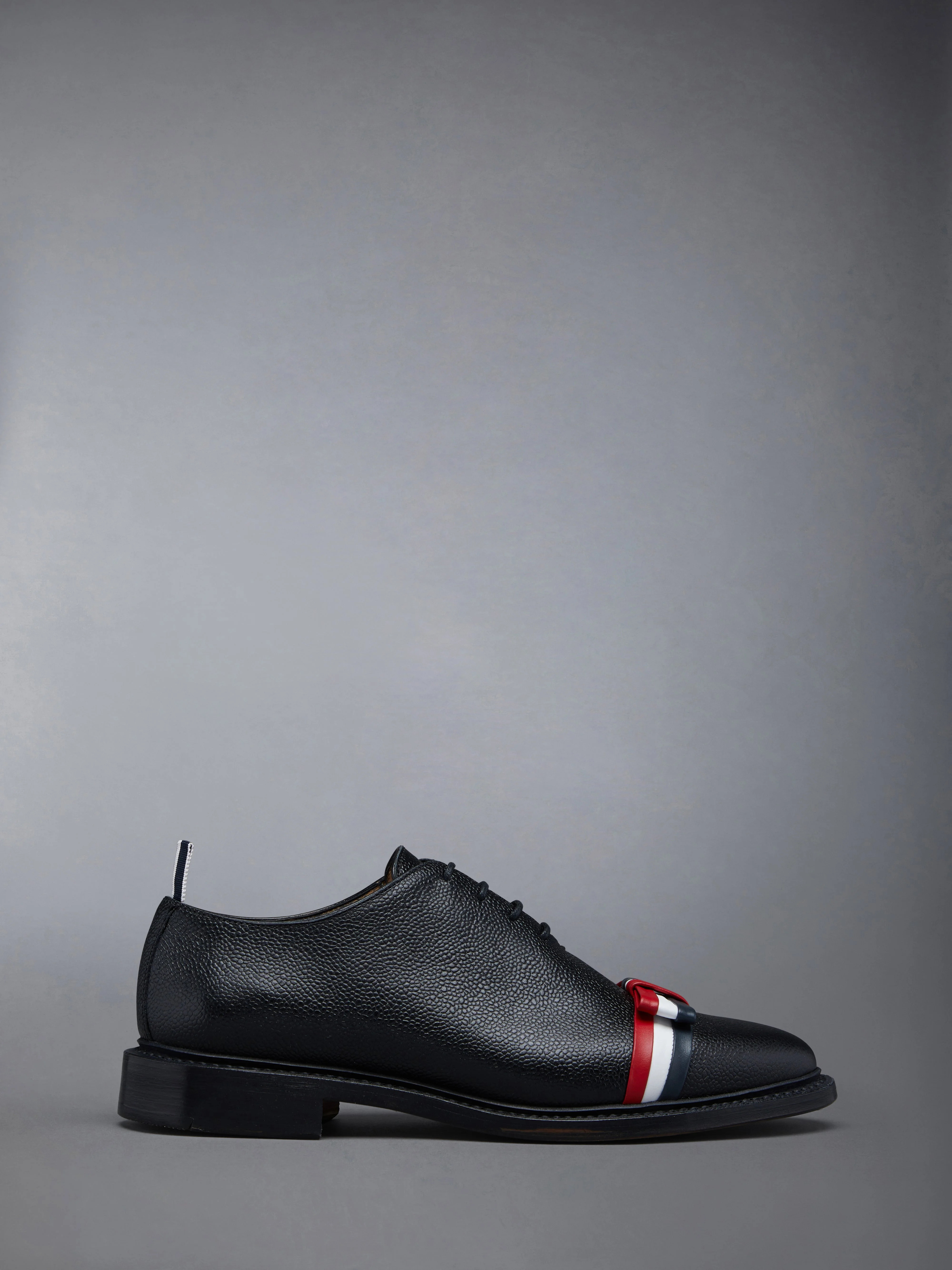 DETAILS & FIT Crafted with two striped leather bows at the toe, our Pebble Grain Bow Wholecut Shoe is a playful reinterpretation of our signature brogue. Lace up closure Leather sole Striped leather bow at vamp Leather insole and lining Signature striped grosgrain loop tabs at heels Upper: 100% Calf Leather Sole: 100% Calf Leather Lining: 100% Calf Leather Made in Italy FFD012A-00198-001