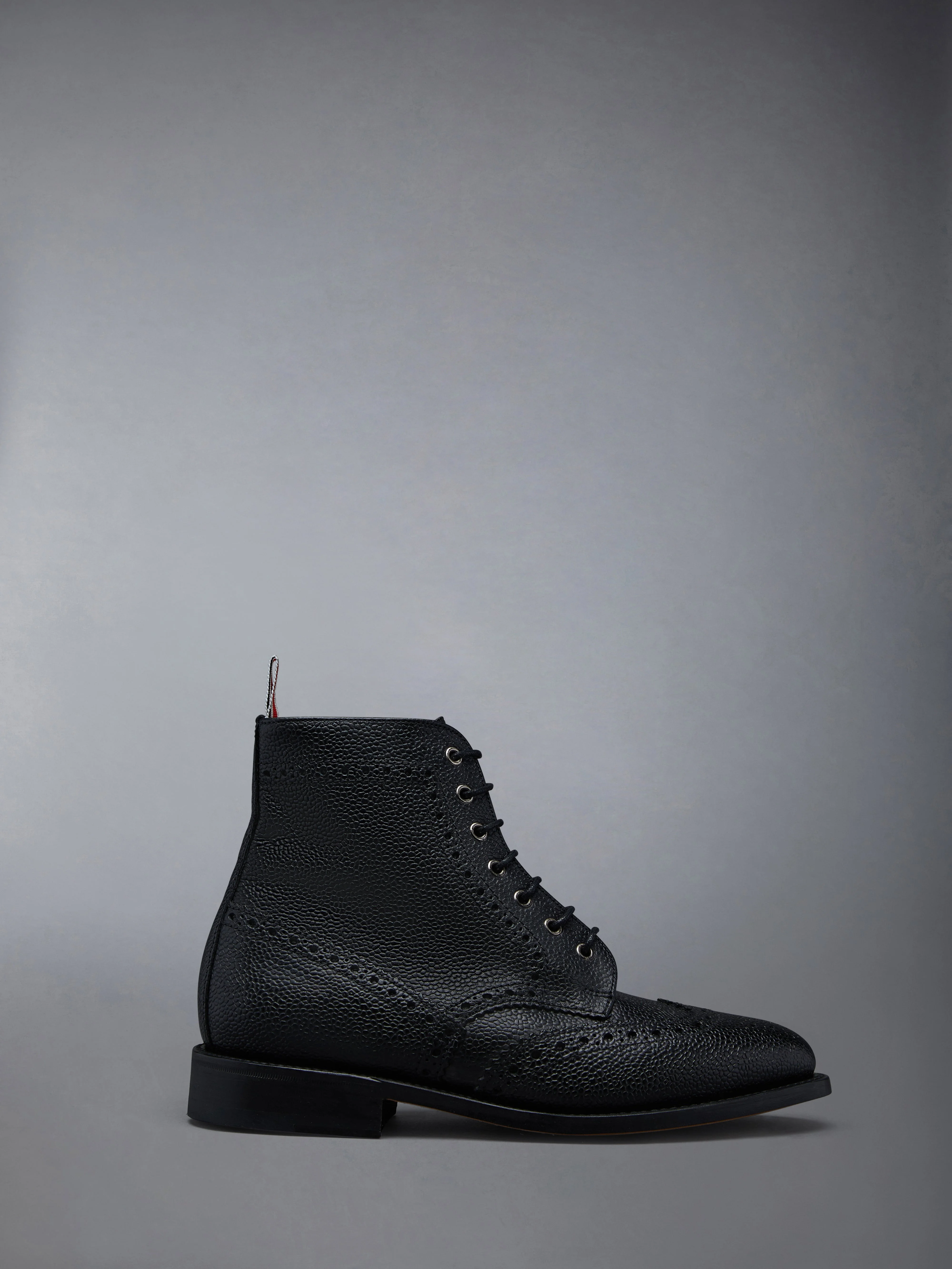DETAILS & FIT Crafted with the highest quality of classic shoemaking, our Pebble Grain Wingtip Boot is a staple in Thom Browne's legacy. Features an elongated toe, tonal leather sole, and streamlined silhouette. Lace up closure at grommeted metal eyelets Perforated broguing throughout Tonal Goodyear leather sole Leather insole and lining Signature striped grosgrain loop tabs at heels Upper: 100% Calf Leather Sole: 100% Calf Leather Lining: 100% Calf Leather Made in the UK FFB018A-00198-001