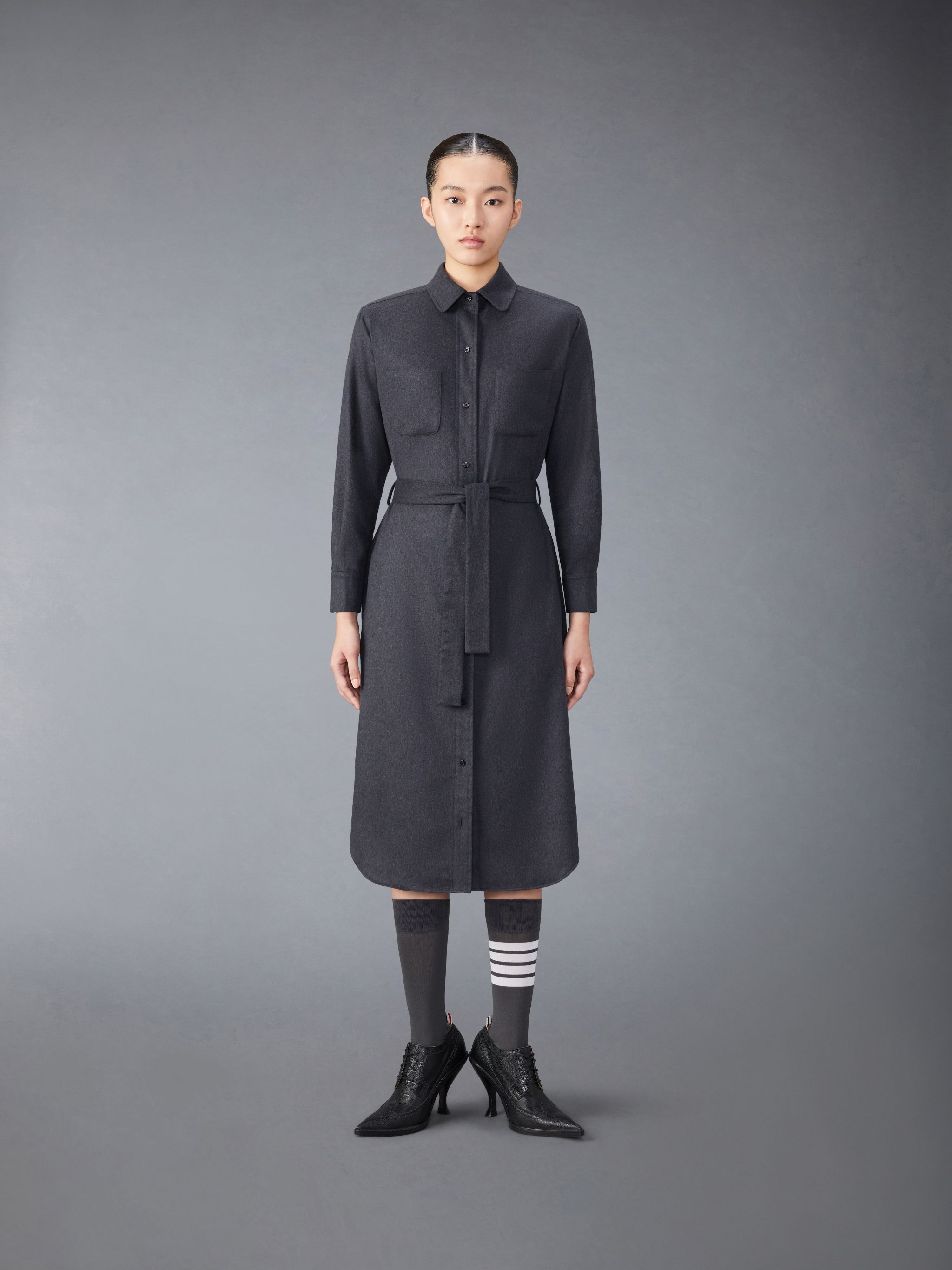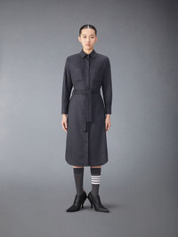 DETAILS & FIT Effortless style meets sophistication with this ultra-flattering light weight cashmere silk shirtdress. Featuring a belted waist and button closure. Front button closure Belted waist Front patch pockets Pleated back yoke with locker loop Signature striped grosgrain loop tab Model is 5'10" (178 cm), wearing size 40 51% Silk, 49% Cashmere Made in Italy FDSE87A-F0648-015