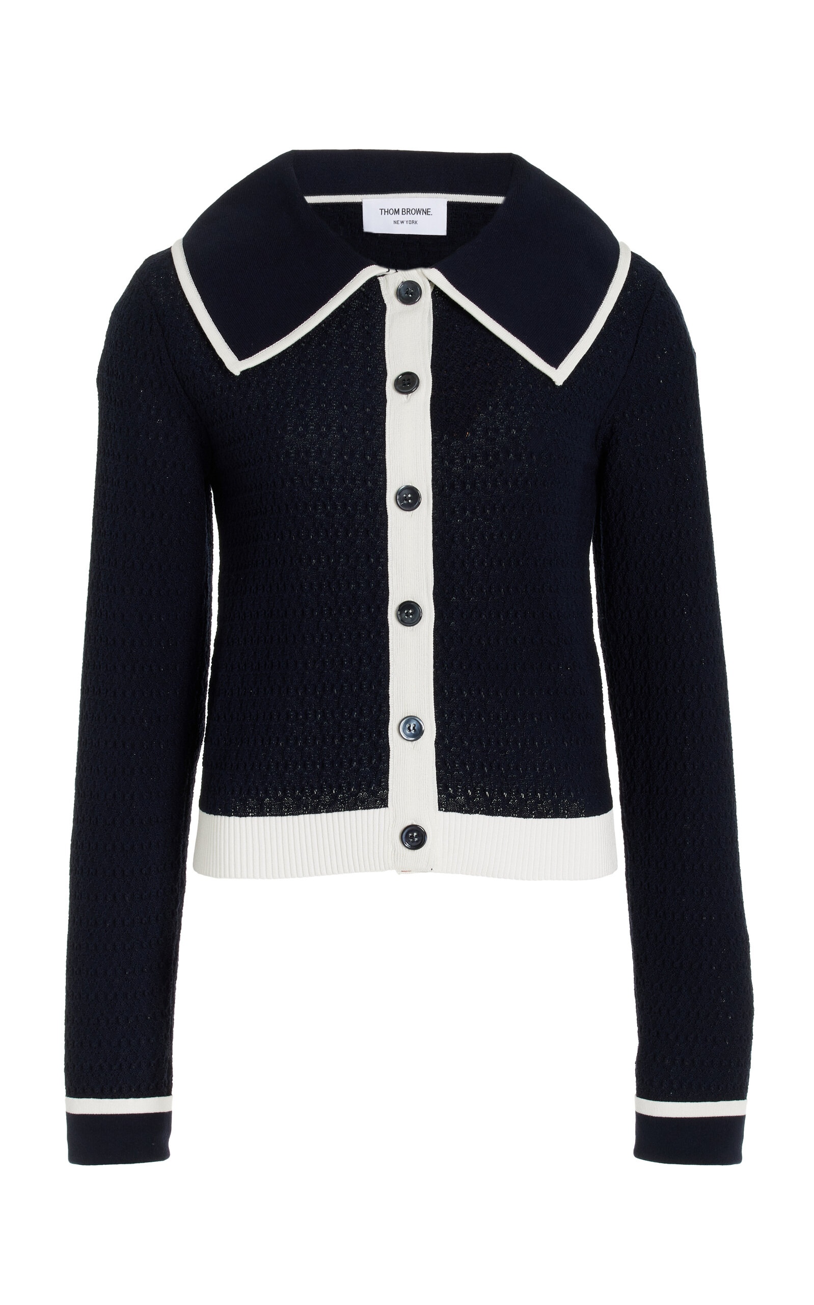 Thom Browne lends his award-winning expertise in menswear to his coveted womenswear collection, adding feminine touches to classic silhouettes that reflect a refined, borrowed-from-the-boys aesthetic. Intricately pointelle-knit with soft cotton yarn, this posh cardigan features a distinct peter pan collar. PRODUCT DETAILS - Pre-Fall '24 - Button fastenings along front - Composition: 100% Cotton - Dry clean - Imported SIZE & FIT - Our model is wearing a size IT 38 - Model is 5'10" with a 34" bust, 24" waist, and 35" hip - Designed for a regular fit