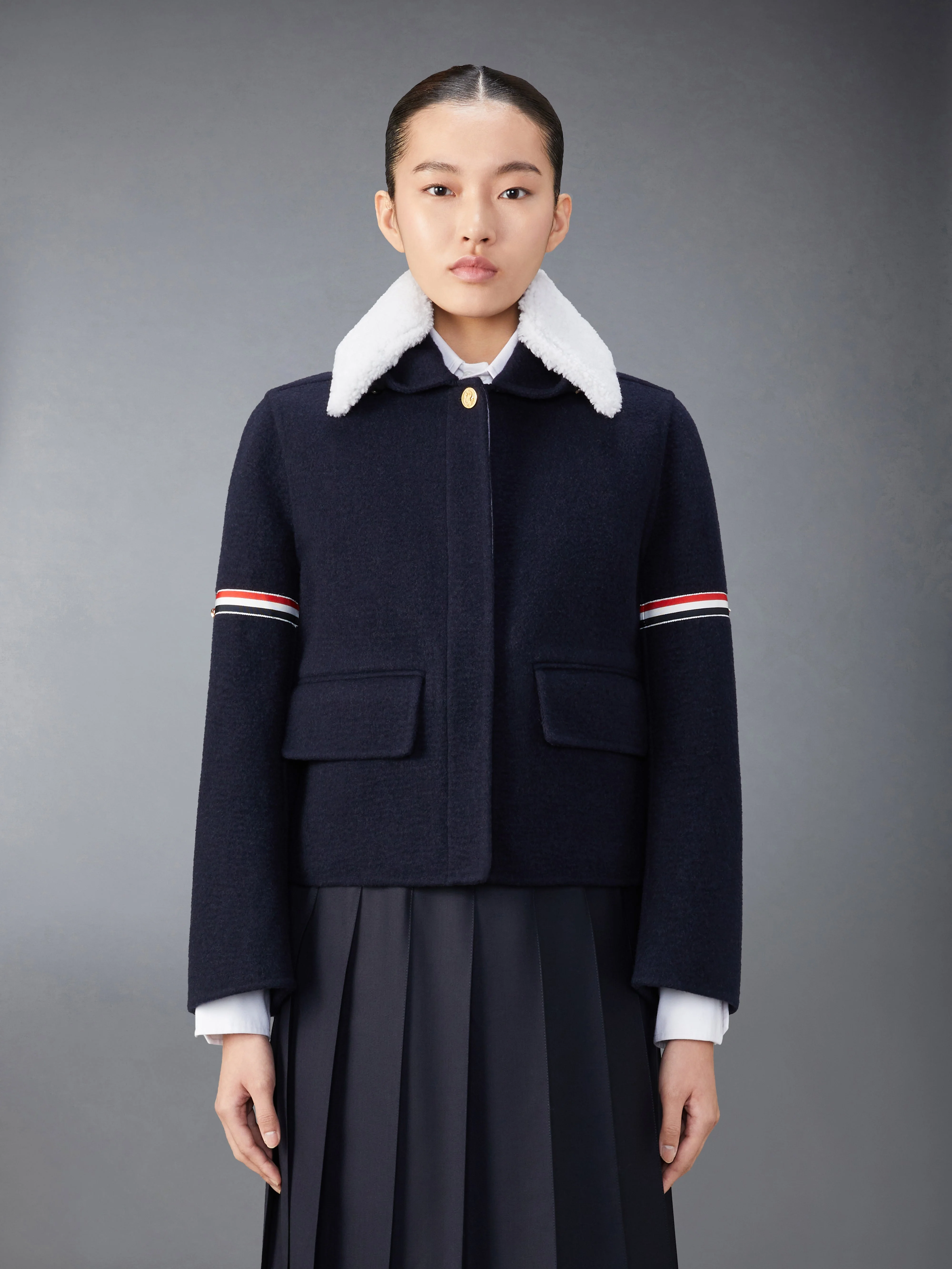 DETAILS & FIT This luxurious jacket is the pinnacle of cold weather sophistication, adorned with Thom Browne signature grosgrain armbands and a warm shearling collar. Hidden front closure 2 flap pockets Interior name tag Signature striped grosgrain armbands with buttons Detachable shearling collar Signature striped grosgrain loop tab Model is 5'10" (178 cm), wearing size 40 90% Wool, 10% Cashmere Combo1: 100% Shearling Leather Made in Italy FBC915C-F0656-415