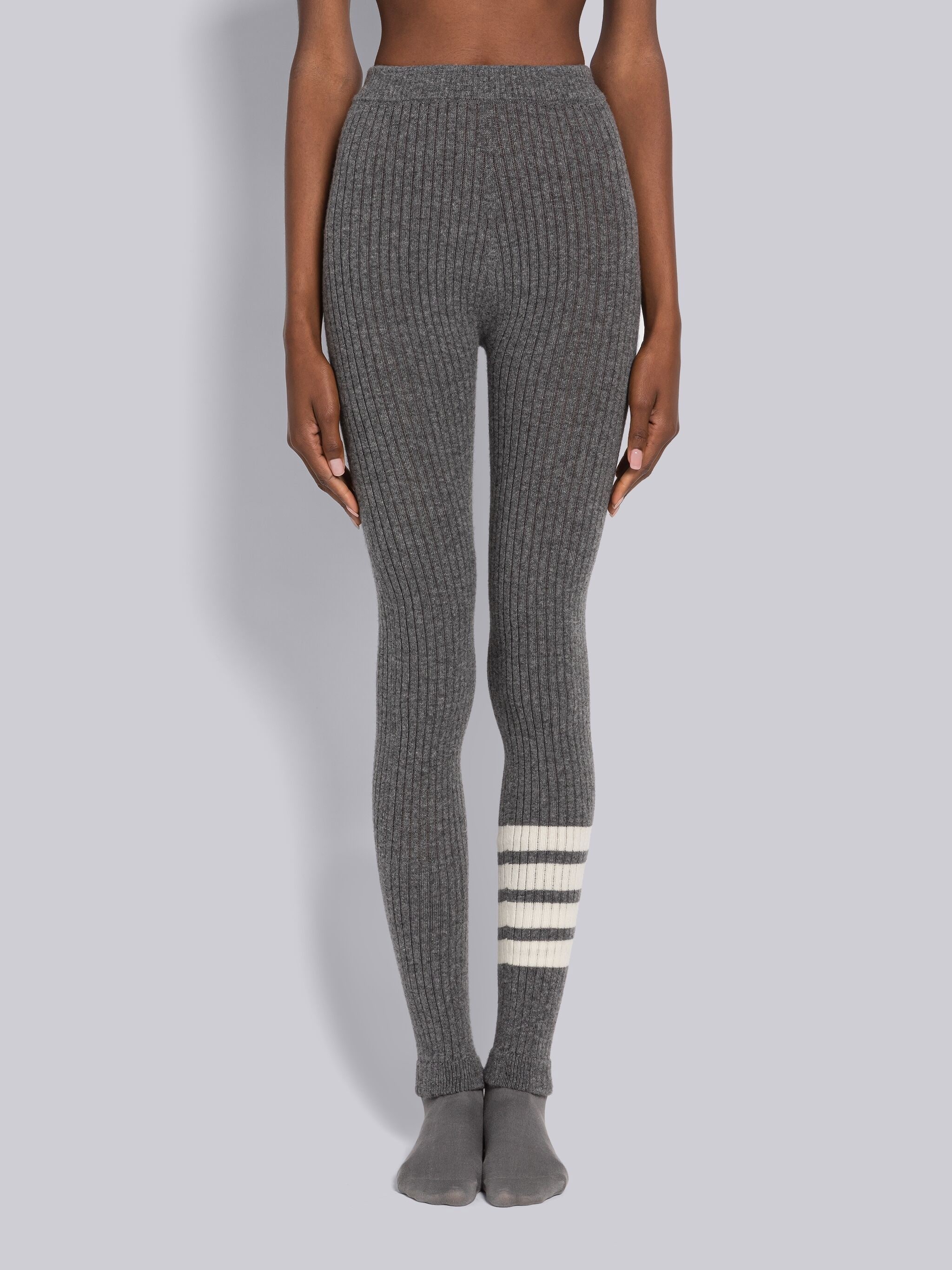 DETAILS & FIT Seamless leggings in grey rib knit cashmere wool with 4-bar stripe detail at left cuff in white. Signature striped grosgrain loop tab at back waist. Made in Italy 56%Wool, 24%Cashmere, 19%Polyamide, 1%Elastane FAS160AY1503035